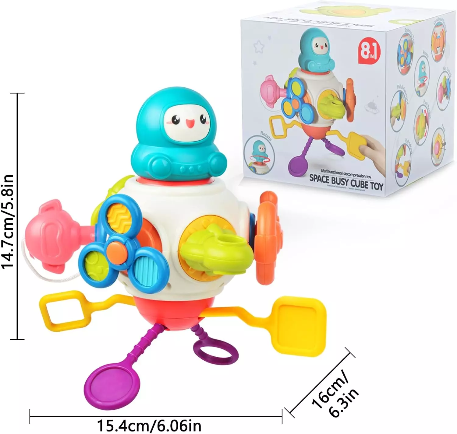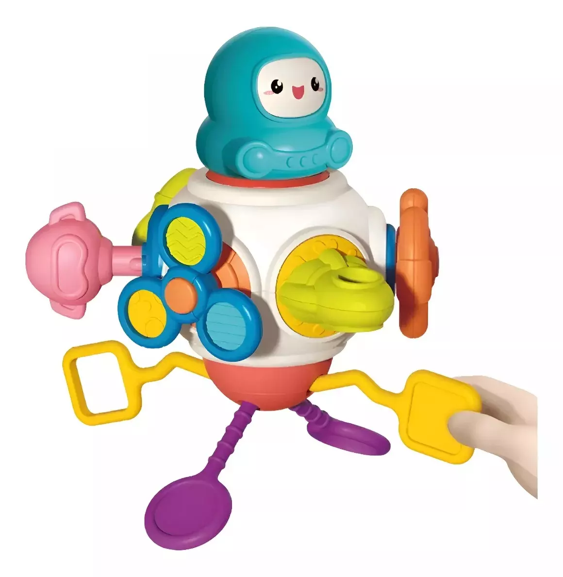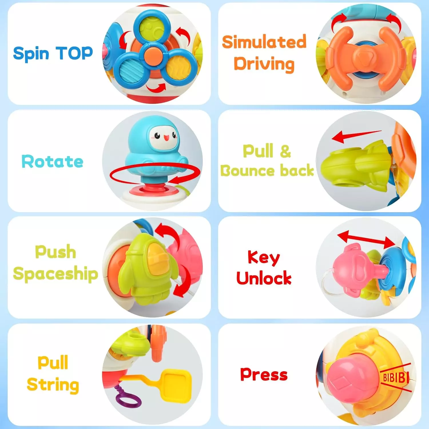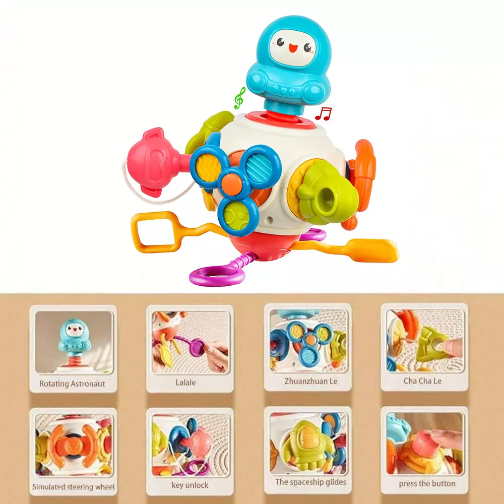Juguete 8 en 1 con diferentes experiencias como astronauta giratorio, parte superior giratoria, cohetes extensibles, volante, cordón de tracción, botón de presión, nave espacial empujable y bloqueo de llave. Juguete Montessori fomentando la creatividad y la imaginación durante horas.