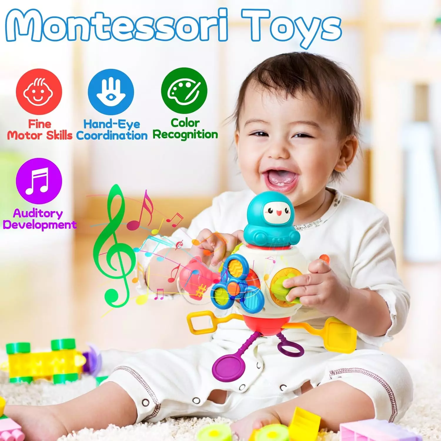 - Diseño liviano y portátil, fácil de transportar. El juguete para bebés puede mantener a su bebé ocupado durante viajes largos en el asiento del automóvil, tren o avión.