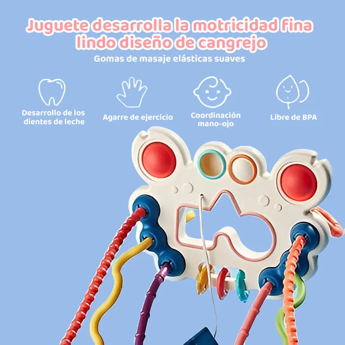 Este tierno cangrejito de colores intensos está diseñado para captar la atención de tu bebé, estimular su visión y brindarle múltiples formas de exploración sensorial.