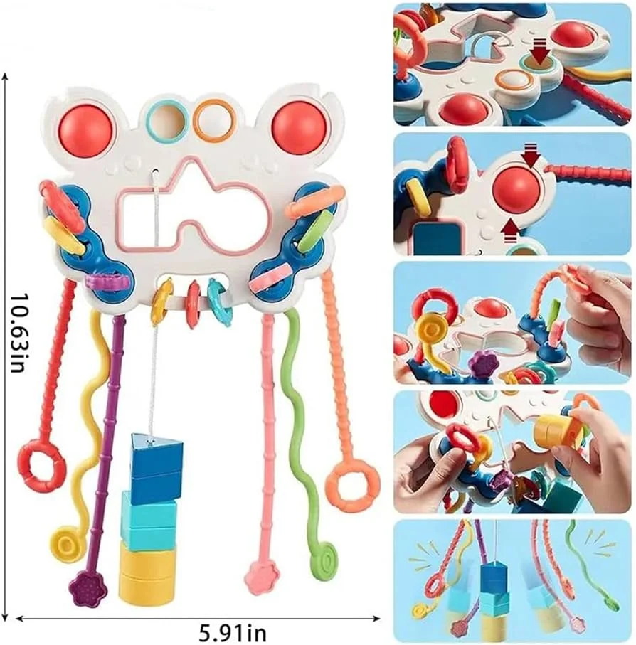 Incluye 6 cuerdas de distintas texturas y formas, perfectas para tirar, empujar y manipular, ayudando a tu bebé a fortalecer sus manos mientras juega.