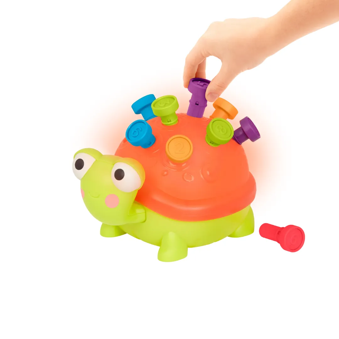 - Estimulación Auditiva y Visual: Cada vez que se coloca una clavija, la tortuga responde con luces y sonidos alegres, reforzando el aprendizaje y la causa-efecto.