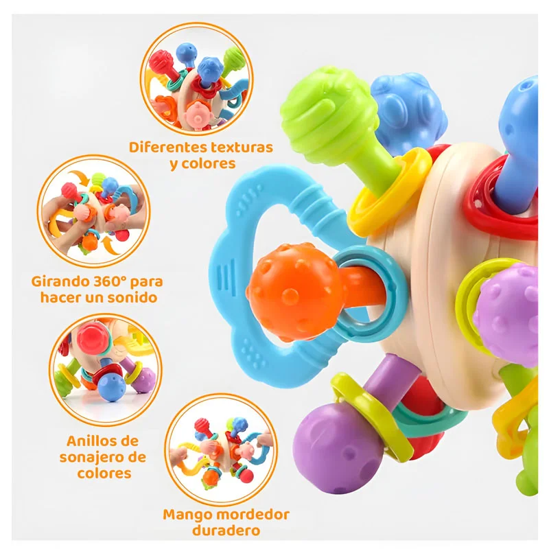 La bola central emite sonidos crujientes y agradables que entretienen, calman y estimulan los sentidos del bebé.