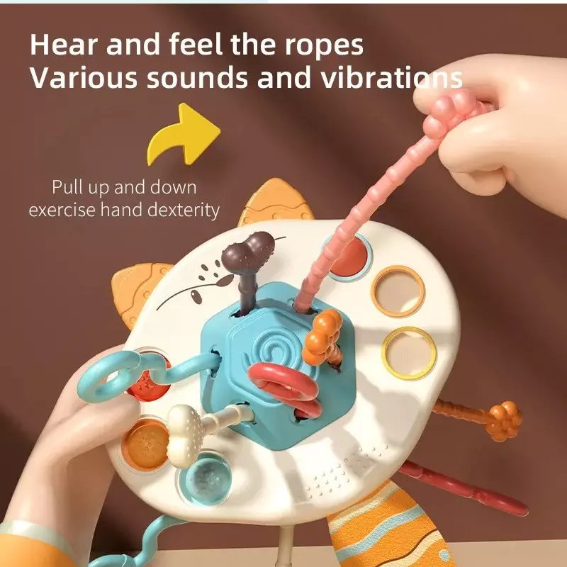 Los bebés exploran este juguete sensorial a través de los diferentes sonidos y vibraciones provocados por tirar hacia arriba y hacia abajo, presionar, masticar, agitar y lo suave, las cuerdas de textura diferente son más fáciles de agarrar para el bebé y promover el desarrollo de los sentidos del bebé.