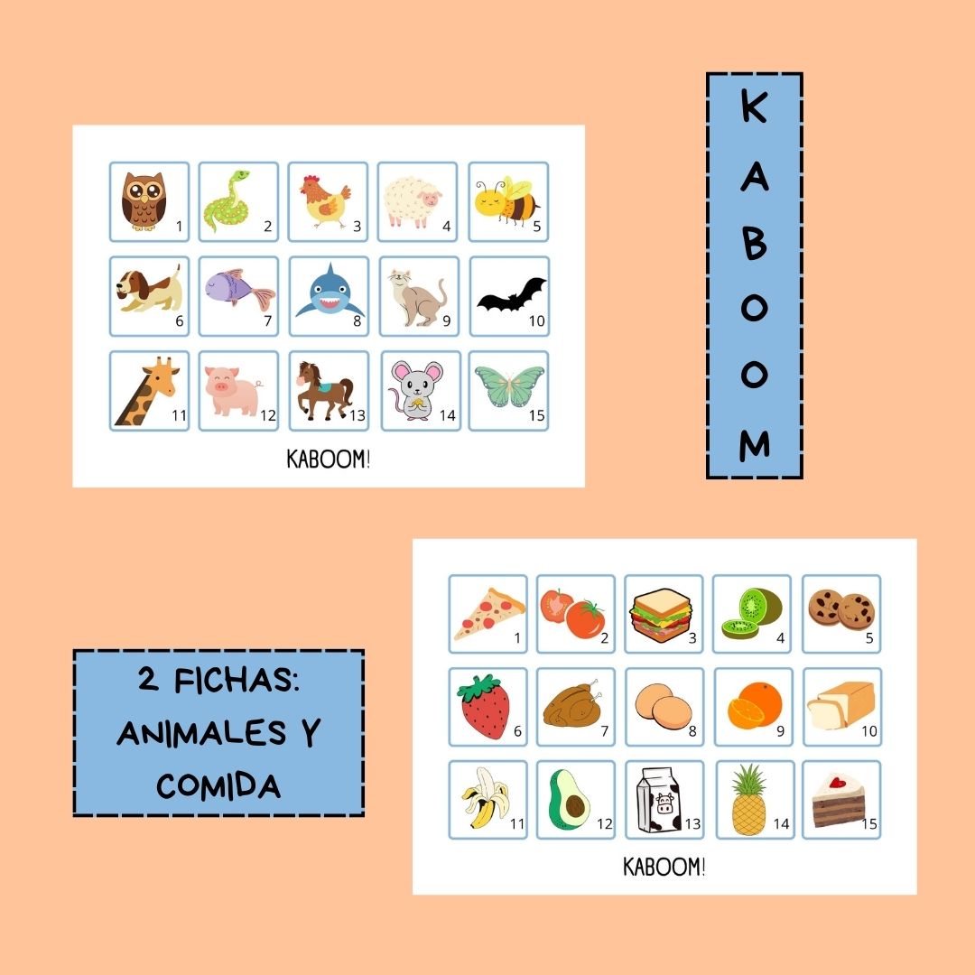Con estas dos fichas que tienes disponibles tu alumnado podrá jugar al Kaboom en las clases de inglés o para practicar lengua. Simplemente debes preparar unos palos con distintos números (cada uno hace referencia a una casilla) y deberán decir el nombre de la imagen. Mediante este juego practican vocabulario al mismo tiempo que se divierten e interactúan con otros/as estudiantes.