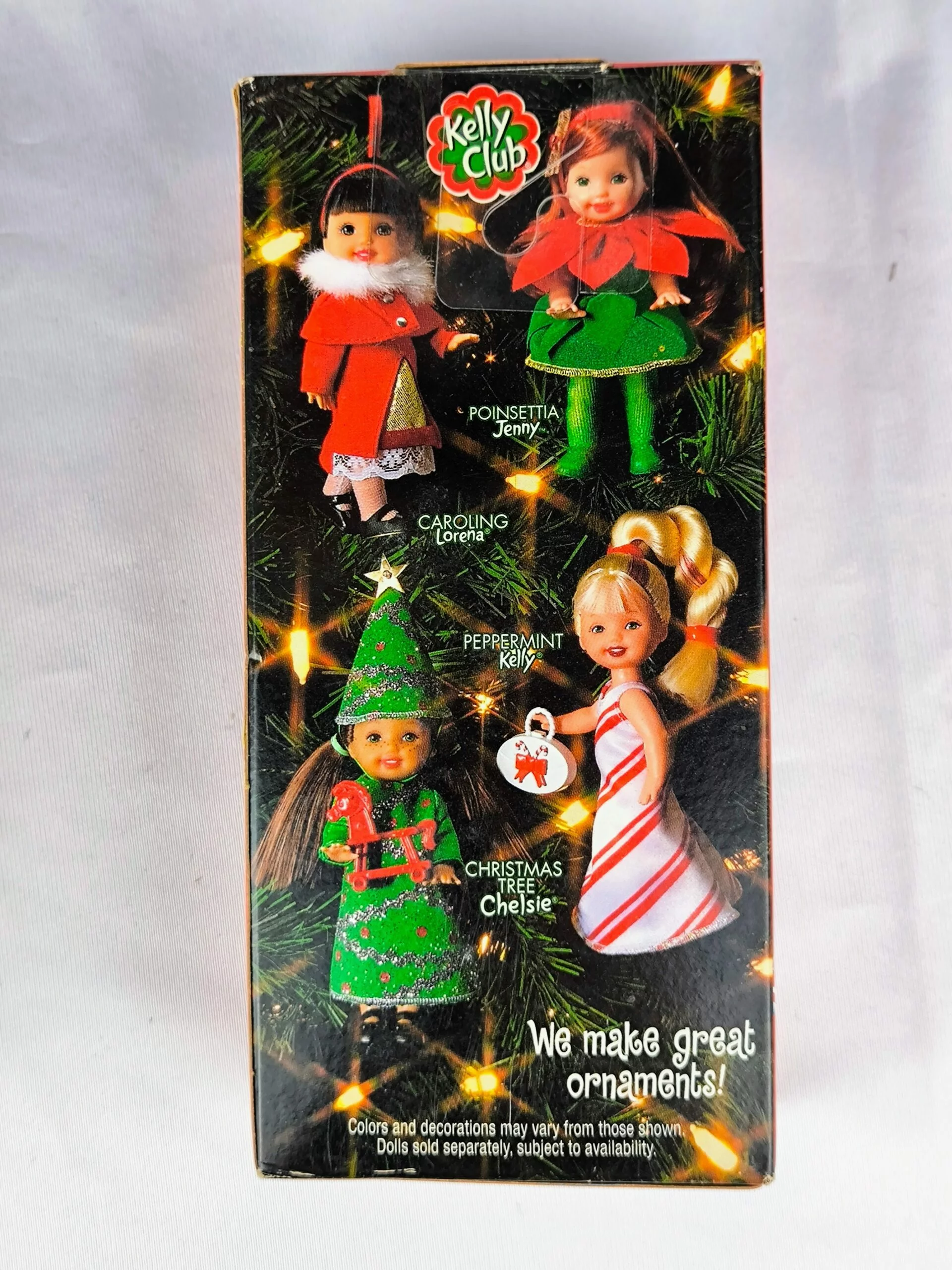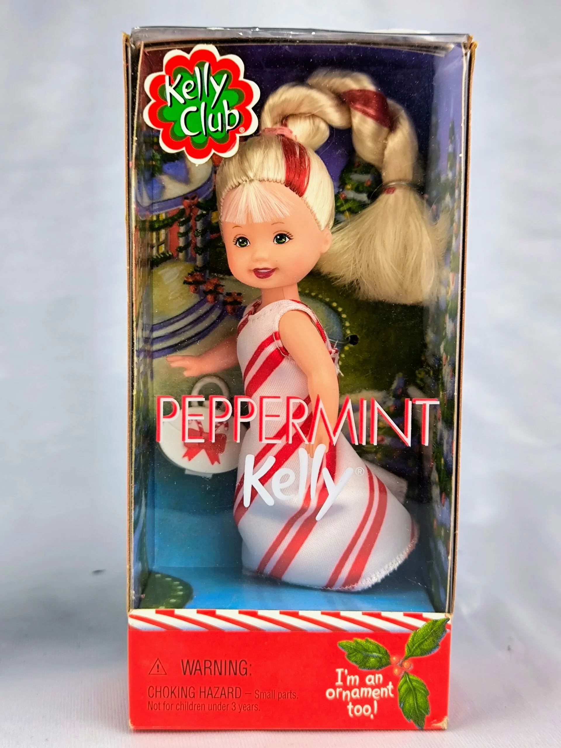 La muñeca Kelly Peppermint de 2001 es una edición especial de la colección Kelly Club de Mattel. Esta muñeca tiene un diseño inspirado en los bastones de caramelo, con un vestido rojo y blanco a rayas diagonales, complementado con un bolso y zapatos a juego. Además, incluye un detalle único: ¡puede usarse como adorno navideño!