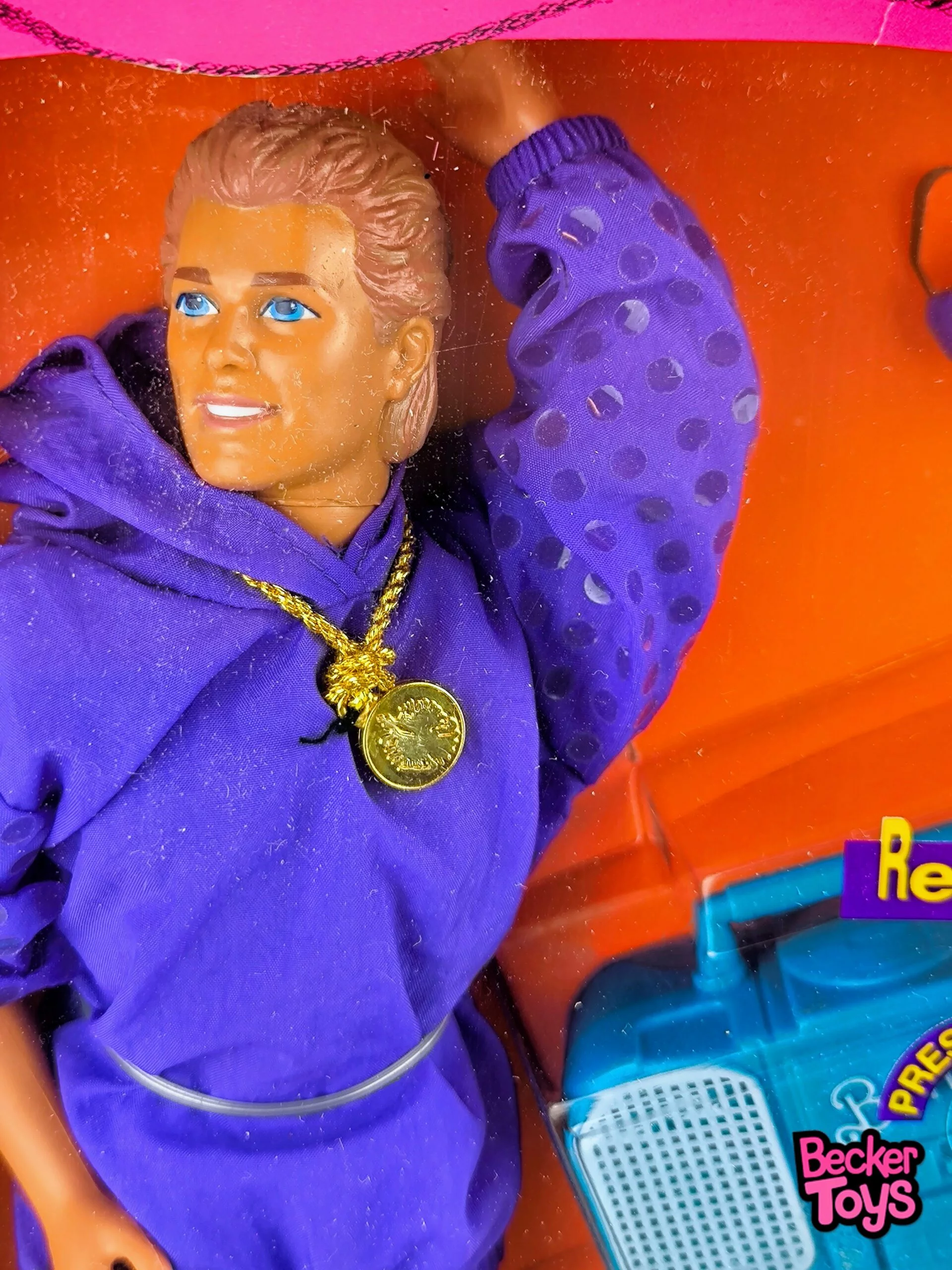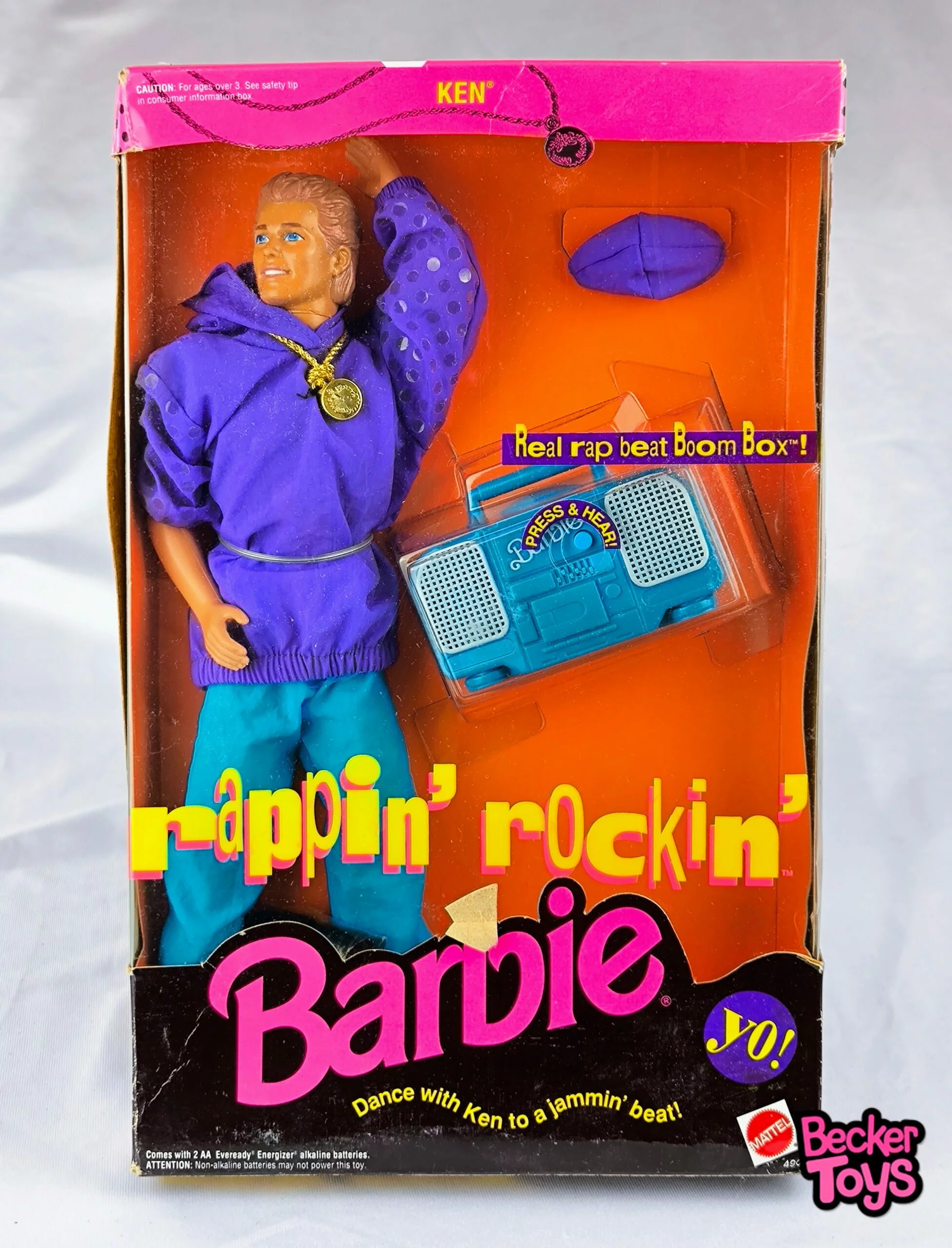 Ken Rappin’ Rockin’ fue lanzado por Mattel en 1991 como parte de una línea que también incluía a Barbie y Christie, todos con estética inspirada en la música rap y el estilo callejero de la época. Esta colección se caracteriza por sus colores vibrantes, accesorios musicales y atuendos llamativos que reflejan la moda urbana de los 90.