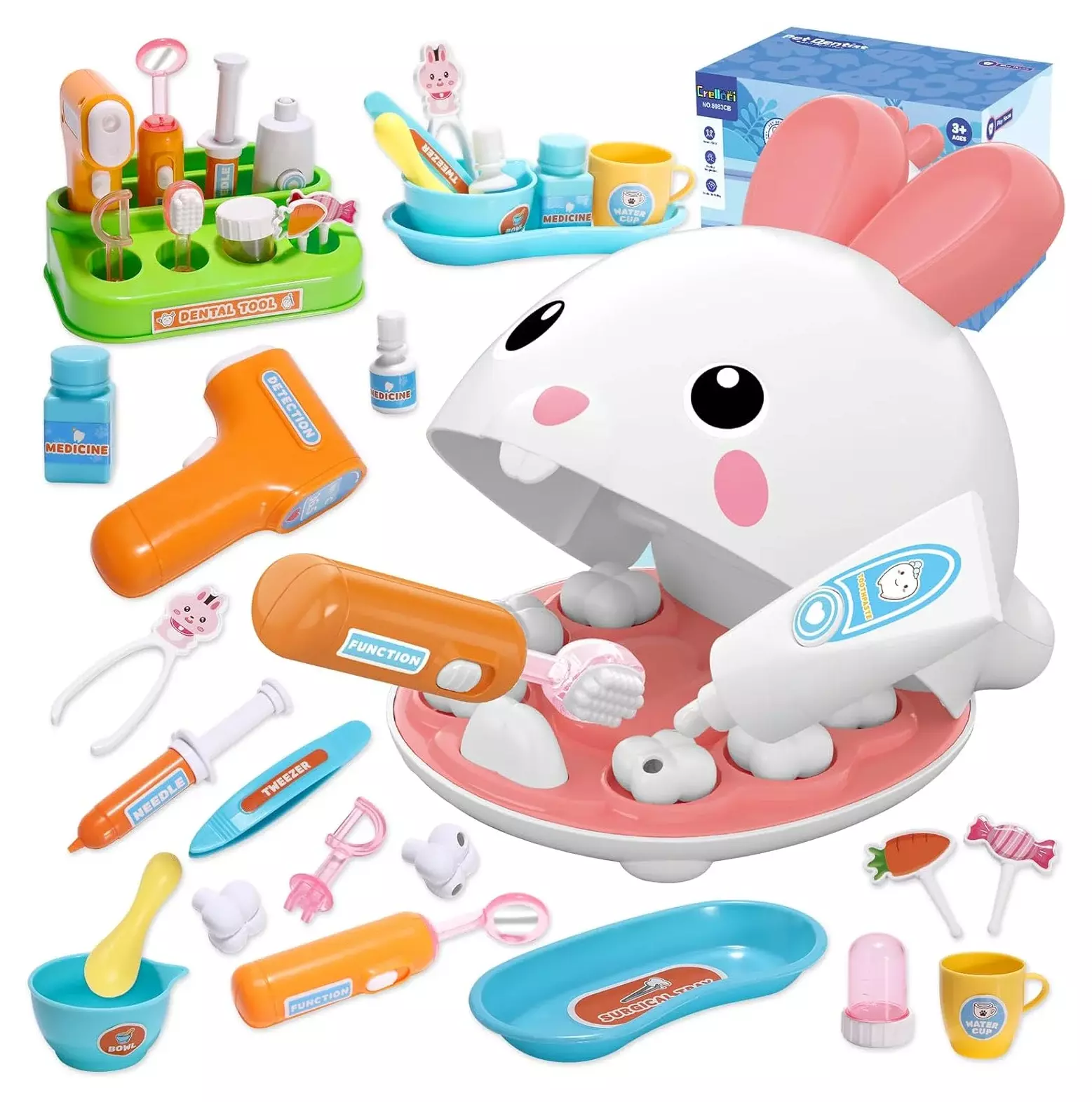 Conviértete en un pequeño dentista con este completo kit de 31 piezas que incluye un conejo dental de juguete, modelos de dientes y accesorios médicos realistas como cepillo, pasta, jeringa, espejo dental, pinzas y mucho más.