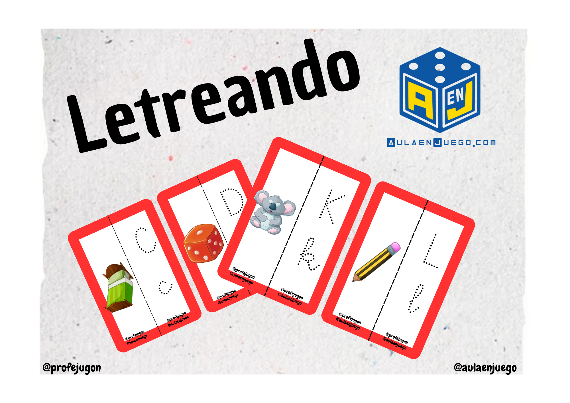 - Colocamos boca arriba todas las tarjetas de ilustraciones y boca abajo en un mazo todas las tarjetas de letras barajadas. Mostramos una carta de letra. Rápidamente los jugadores deberán coger todas las tarjetas cuyo dibujo contenga esa letra. Vamos puntuando cada turno en función al número de cartas cogidas de esta manera.