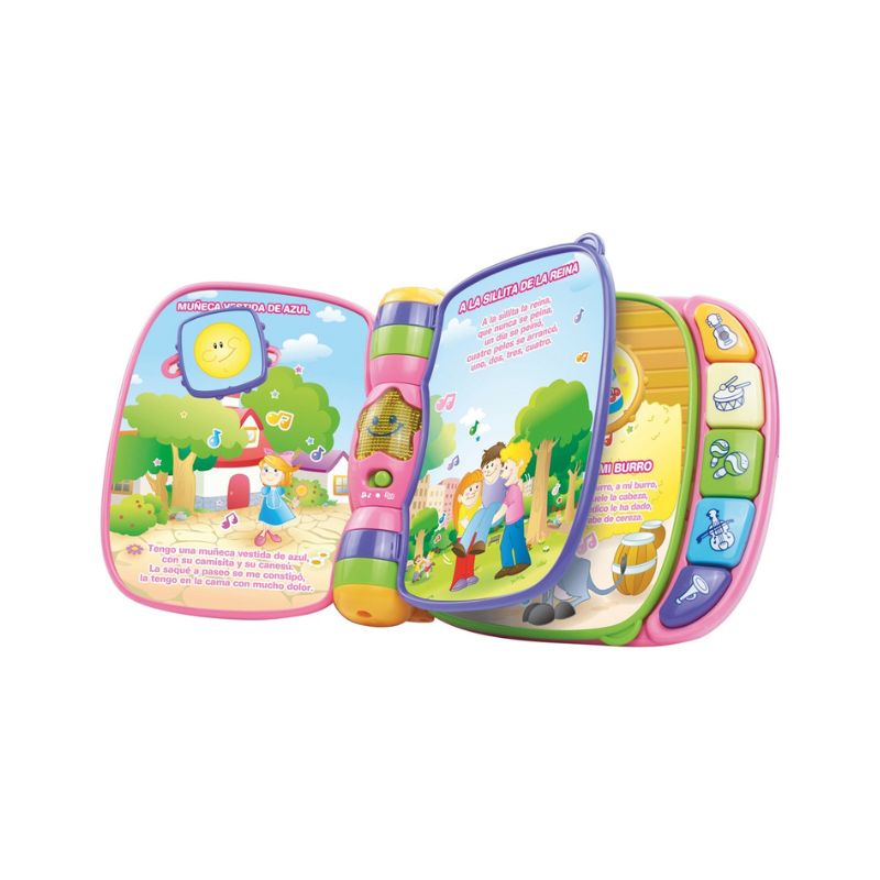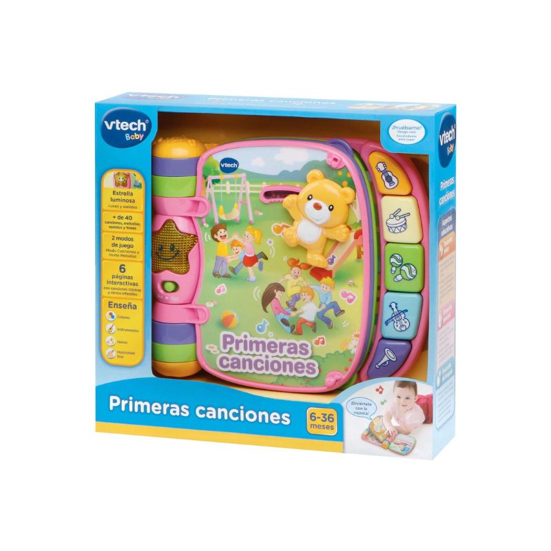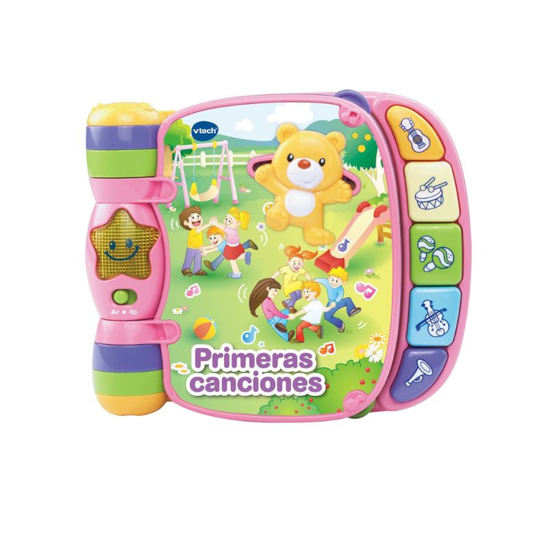 Escucha y disfruta de los ritmos más divertidos con el libro Primeras canciones de Vtech Rosa. Contiene 6 canciones populares y 6 melodías clásicas.