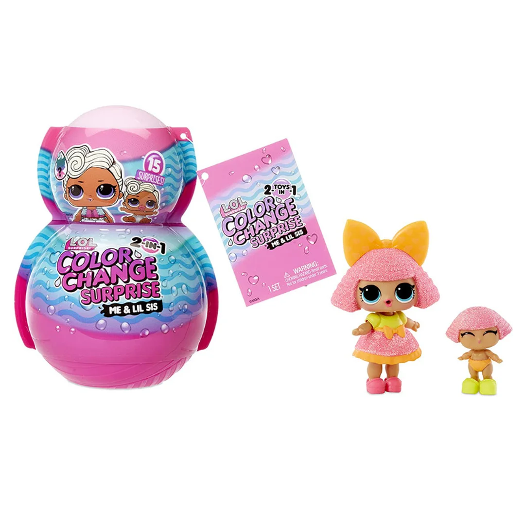 ¡Descubre la diversión con LOL Surprise Me & My Lil Sis Color Change Surprise 2-in-1! Esta increíble muñeca incluye dos sorpresas: una muñeca y su mini versión, perfecta para los fans de LOL que adoran el cambio de colores. Solo tienes que sumergirlas en agua fría o tibia para ver cómo cambian de color y sorprende a tus peques con cada revelación. ¡Es una experiencia única que les encantará!