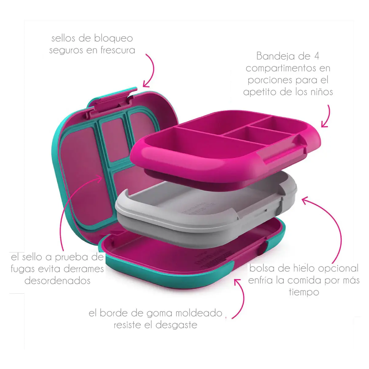 Esta fiambrera con compartimento para bolsas de hielo mantiene sus comidas frescas y frías. Simplemente coloque el paquete de hielo incluido en el congelador durante la noche y colóquelo en la lonchera los días que desee mantener la comida fría mientras viaja. El diseño aislado de esta fiambrera bento para niños también funciona muy bien para alimentos más calientes, ¡simplemente omita la bolsa de hielo!