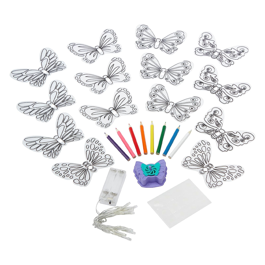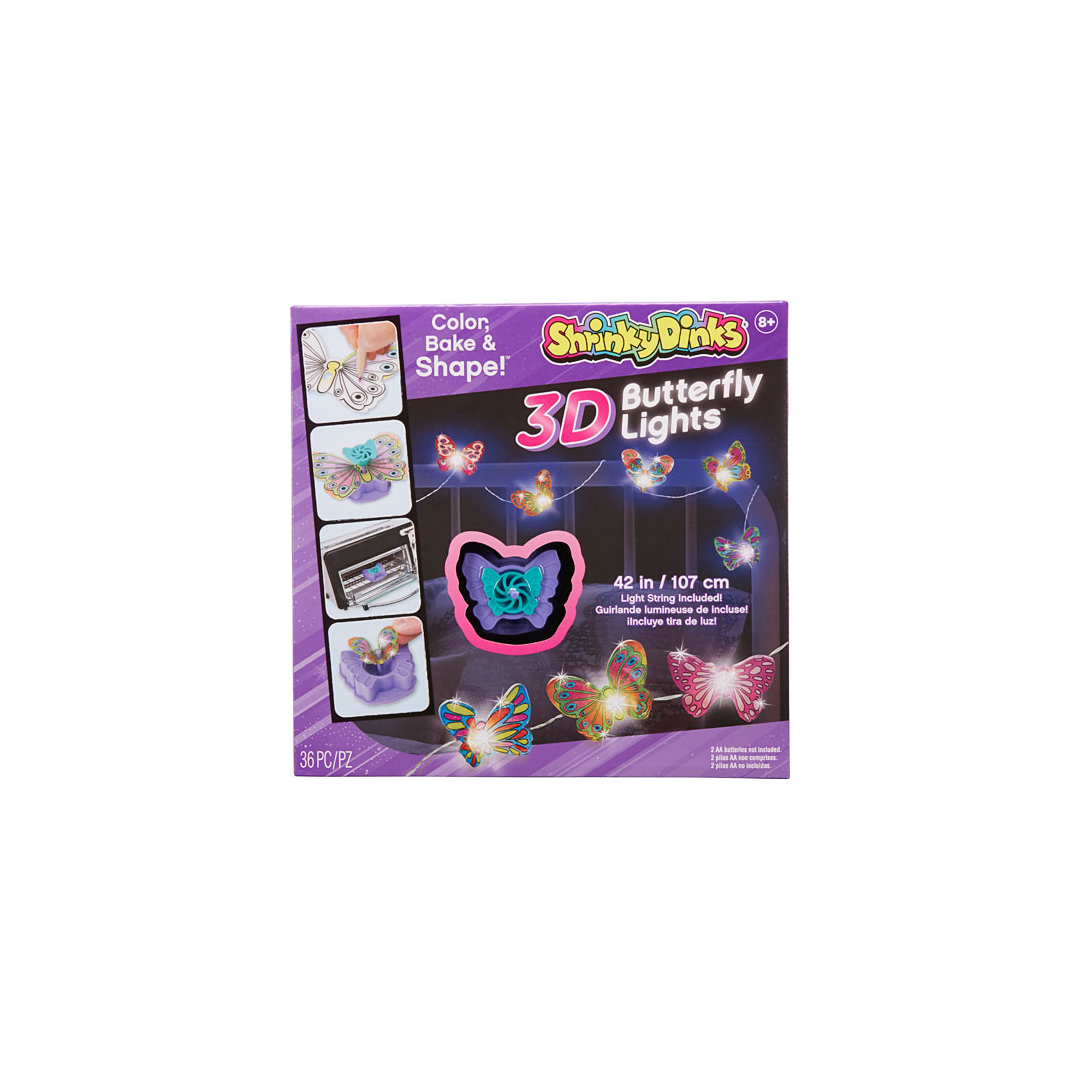 Shrinky Dinks 3D Mariposa Luces convierte tu dormitorio en un hábitat de mariposas que se ilumina! El nuevo molde de silicona en las formas de las alas como se achica, añadiendo una nueva dimensión al clásico de artesanía. El Color y reducir el tamaño de su mariposas y adjuntarlos a la batería operada por la cadena de luces. Con los colores personalizados que usted elija, el conjunto añade un único y alegre atmósfera dondequiera que y rsquo;re colocado. Requiere 2 baterías AA, no incluidas. Incluye Mariposa molde de silicona, cadena de LED con 10 luces LED, 8 lápices de colores, 14 de pre-corte y preimpresos mariposas, 12 puntos de pegamento y unas sencillas instrucciones. Recomendado para niños de 8 años de edad y mayores.