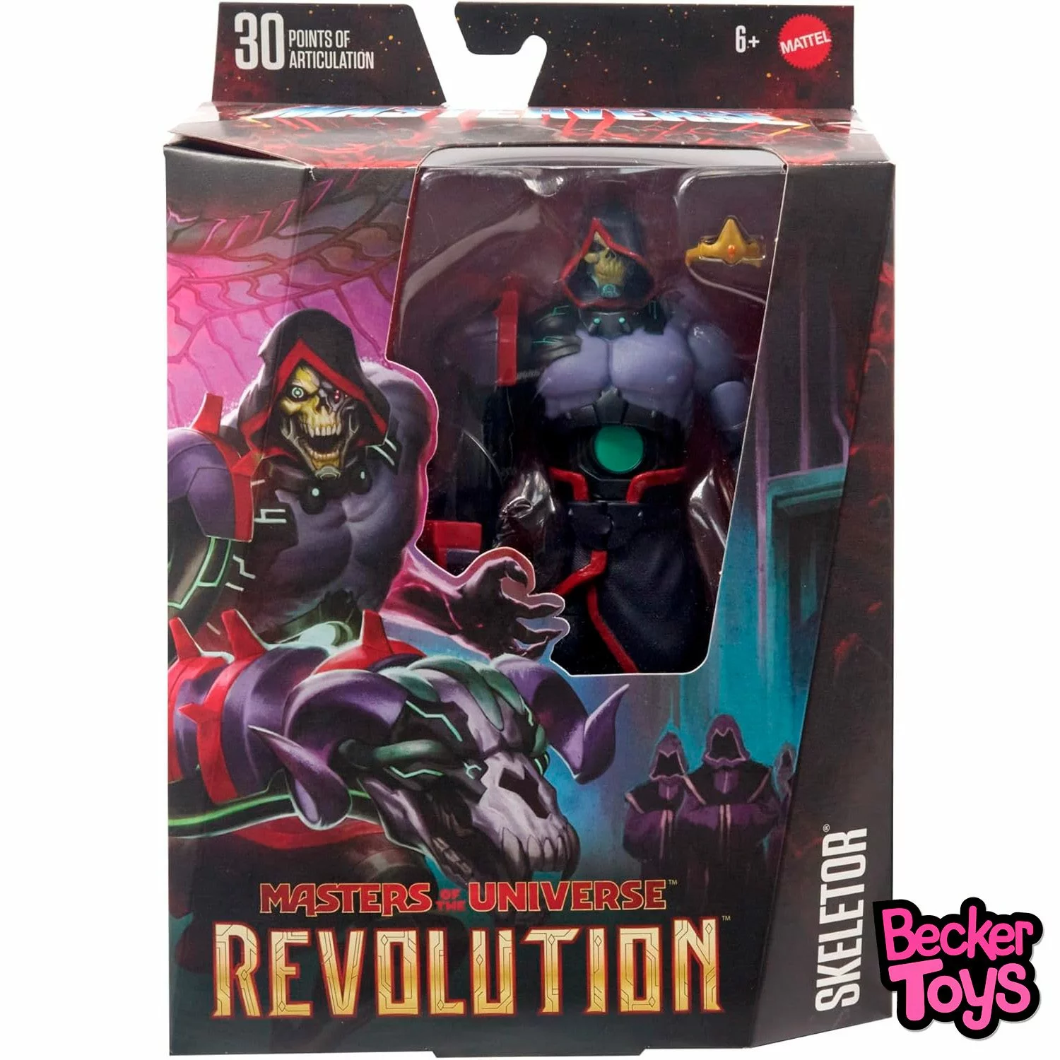 Descripción del Producto: La Masters of the Universe MOTU Revolution Skeletor es una figura de acción coleccionable basada en la serie «Masters of the Universe: Revolution». Esta versión de Skeletor está transformada en un esclavo cibernético por la secta de Motherboard, dándole un aspecto tecnológico y futurista.