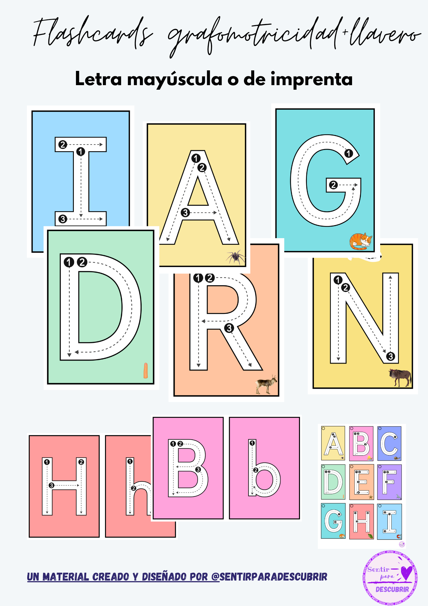 Tarjetas para practicar el trazo de las letras mayúsculas y de imprenta. Se recomienda plastificar para que puedan repasarlas con rotuladores borrables.