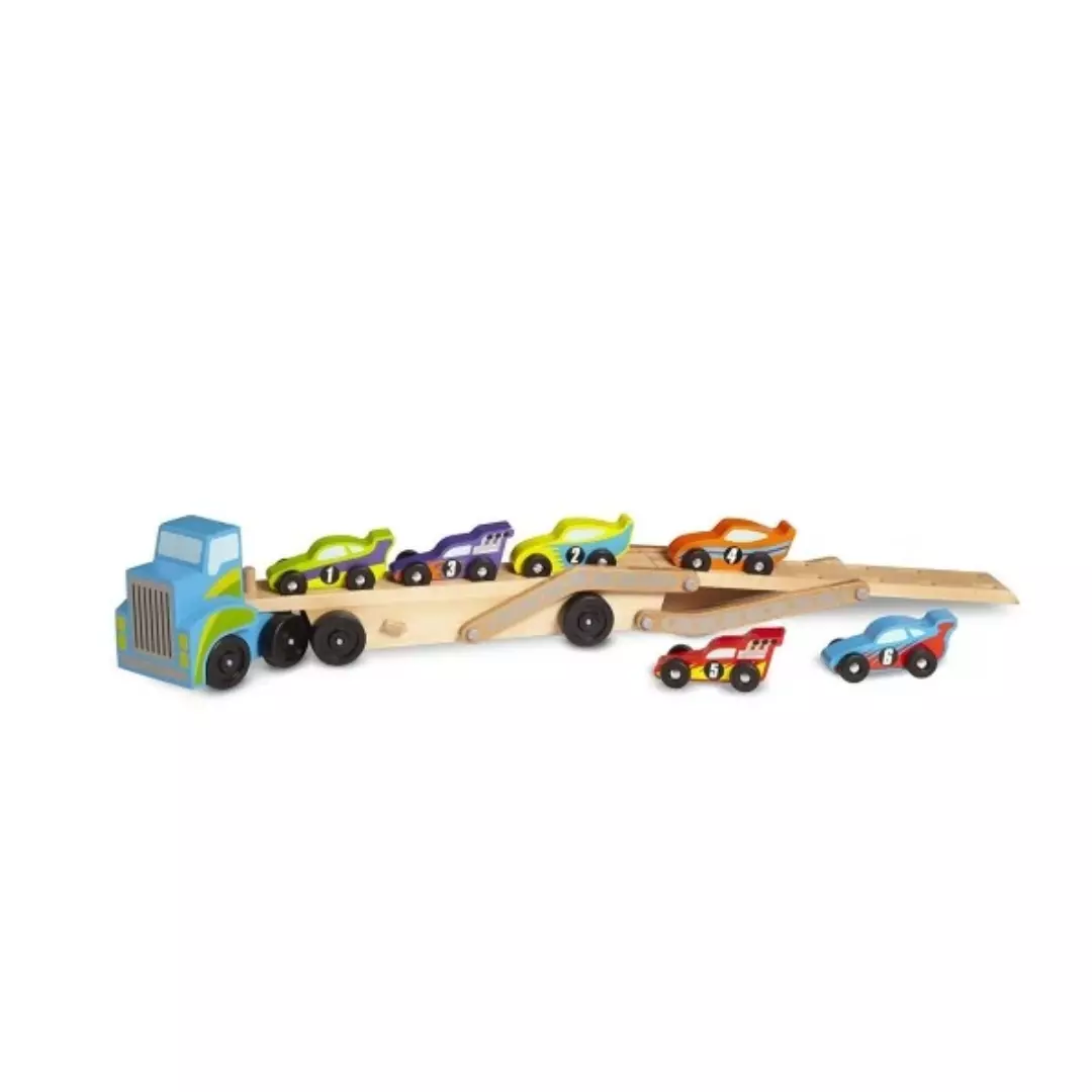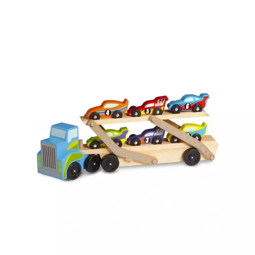 Este camión gigante viene equipado con seis coches y posibilidades de juego ilimitadas. Baje la plataforma superior para permitir que la flota de autos de carreras baje del camión y corra; los niños desarrollarán habilidades motoras mientras juegan.