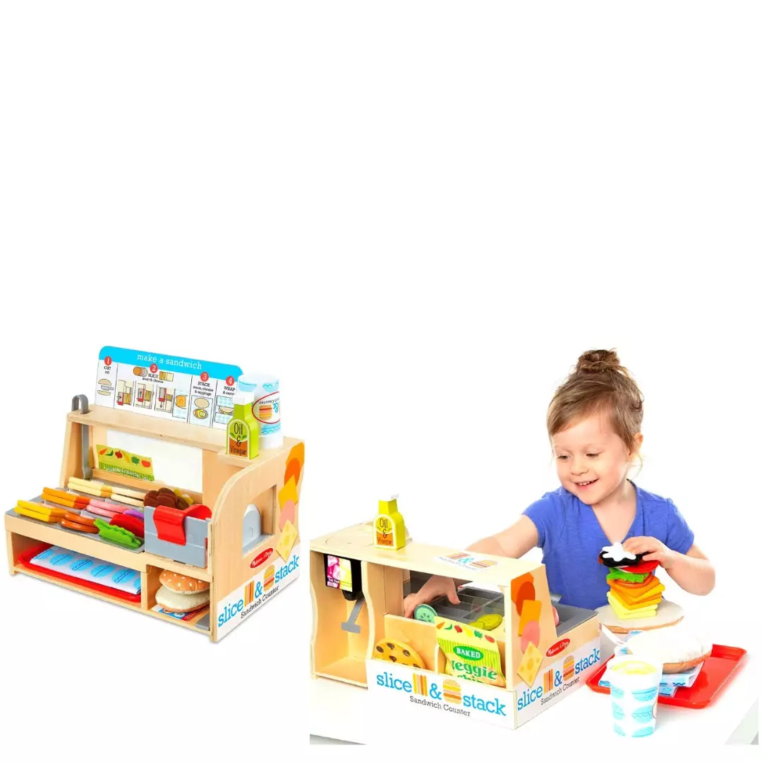 Una guía ilustrada ayuda con la preparación de sándwiches y muestra a los niños cómo usar la rebanadora. Las 52 piezas se guardan en el mostrador de sándwiches para una fácil limpieza. Es una forma deliciosamente divertida de fomentar el conteo, la clasificación y las habilidades motoras finas, así como el juego imaginativo y la narración de cuentos.