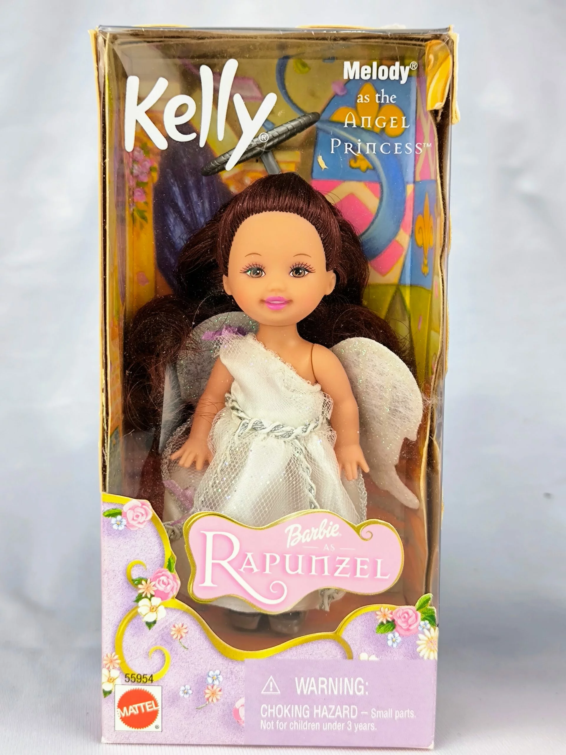 La muñeca Rapunzel Melody como Angel Princess es una edición especial de Mattel que combina elegancia y fantasía. Esta muñeca tiene cabello castaño y ojos marrones, y luce un vestido blanco angelical con alas y zapatos plateados. Es parte de la colección de muñecas Kelly y fue lanzada en el año 2001.