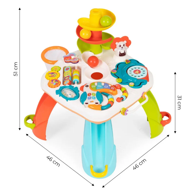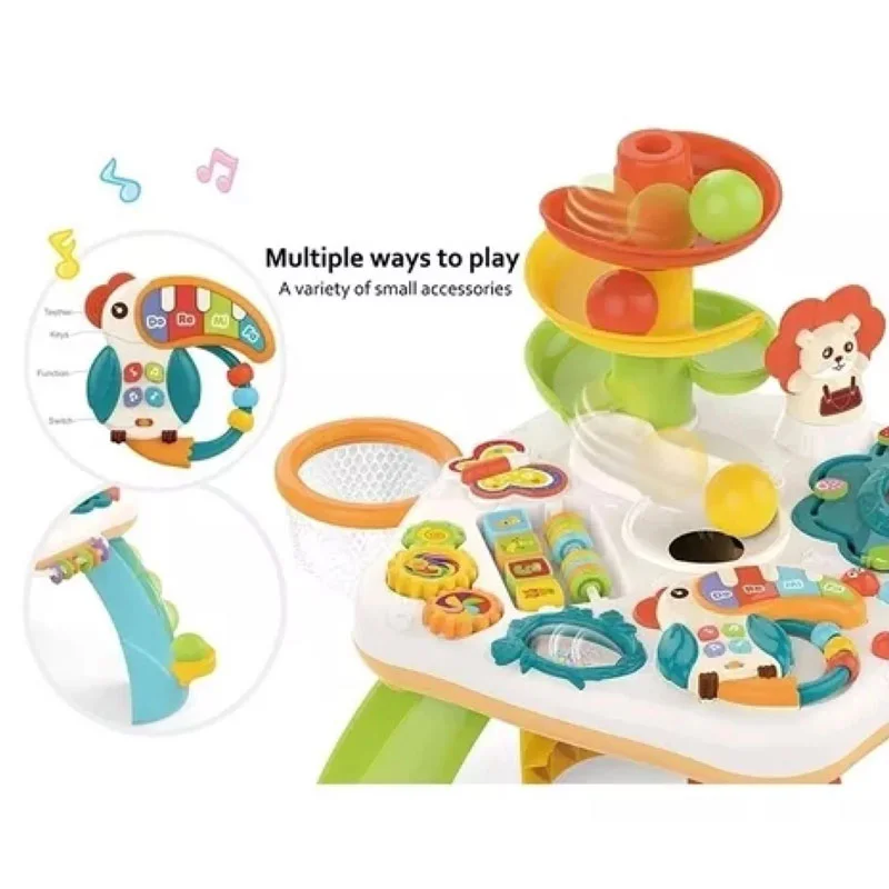 Esta mesa de actividades para bebés mejora con modo de música y canción, así como la función de la educación temprana. No solo está equipado con diferentes juguetes, sino que también está equipado con diversos modos para que los niños reconozcan números, colores, formas, colores, música y animales.