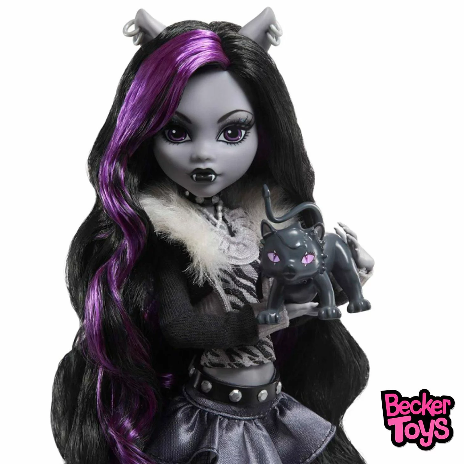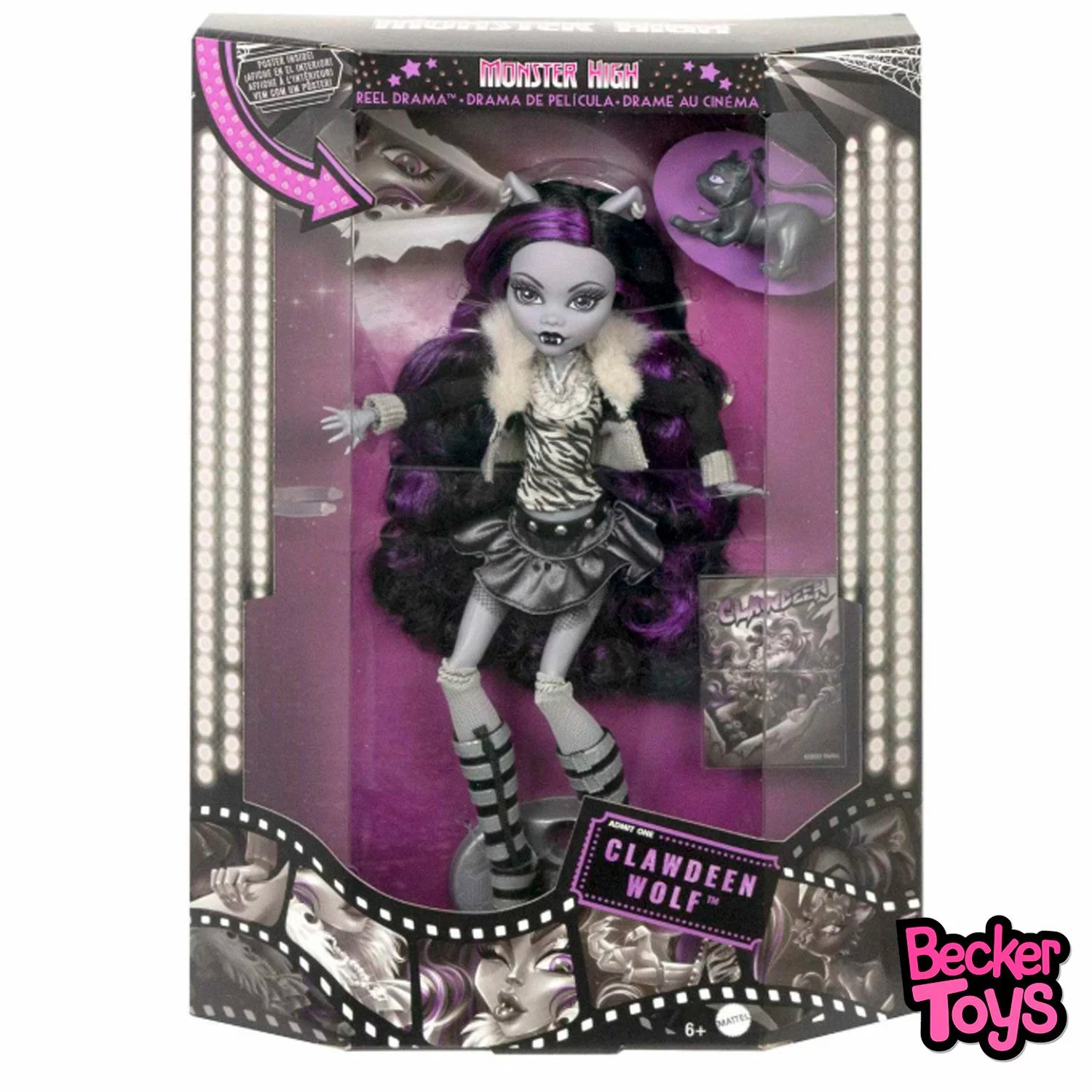 La colección Monster High Reel Drama rinde homenaje a los clásicos filmes de terror en blanco y negro. La muñeca Clawdeen Wolf de esta colección tiene el cabello rizado que cae por su espalda, con los característicos reflejos morados. Lleva una chaqueta de falso pelo corta, falda acampanada y botas de tacón bajo. Junto a ella está su fiel gato, Crescent. La muñeca viene con un póster de película diseñado al estilo de los thrillers clásicos, disponible en dos tamaños: uno de tamaño de muñeca y otro de tamaño real.