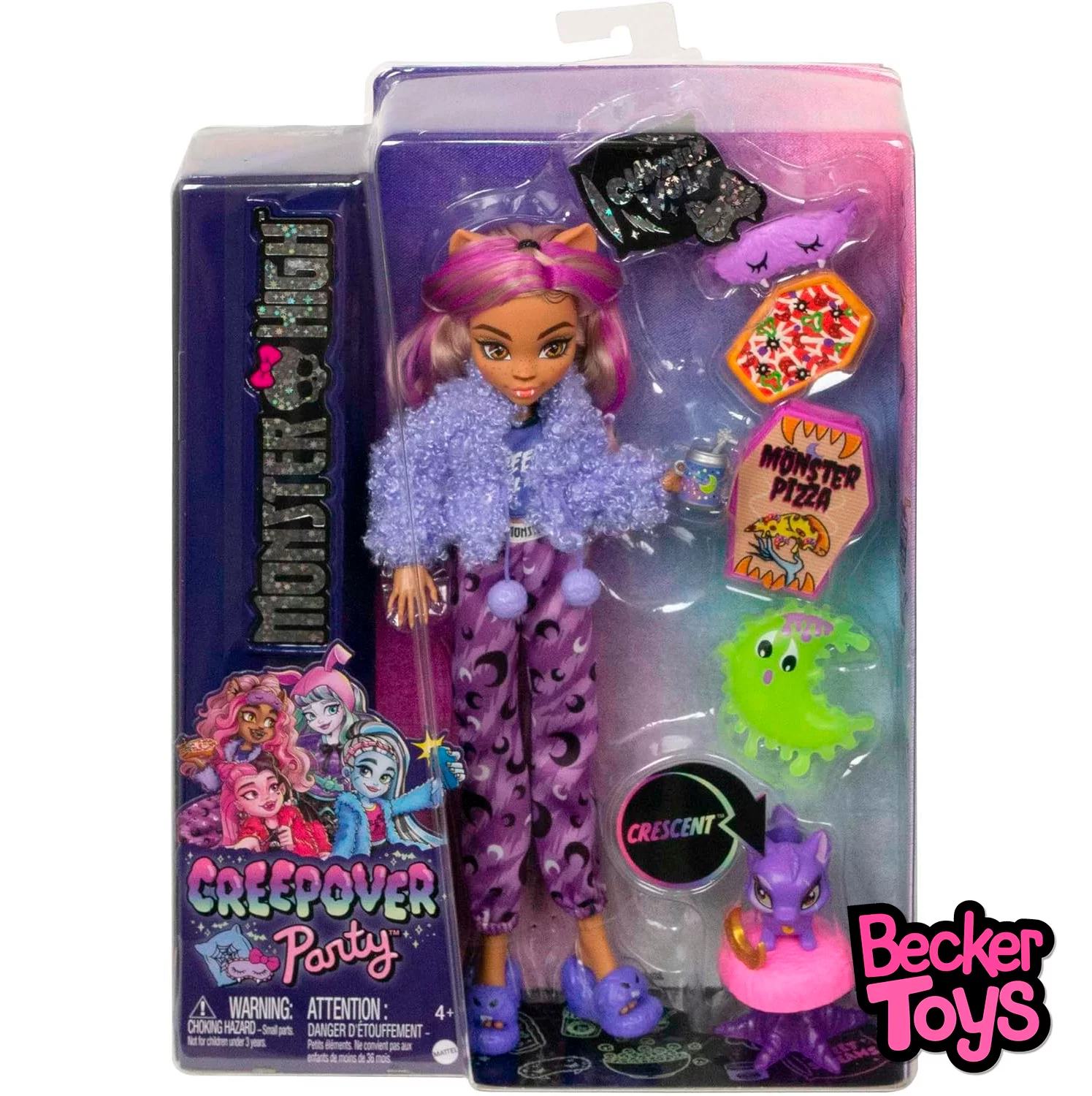 Incluye unamuñeca Clawdeen Wolf con conjunto, un antifaz para dormir, unabotella de kom-buuu-cha, una pizza con caja, una almohada suave, una figura de Crescent y una cama para mascotas. Las muñecas Creepover Party de Monster High tienen un conjunto detallado y accesorios de fiesta de pijamas inspirados en su monstruosa herencia, así como una figura de mascota.