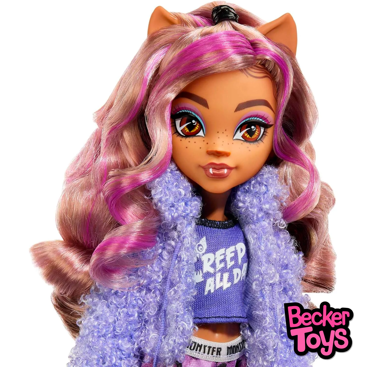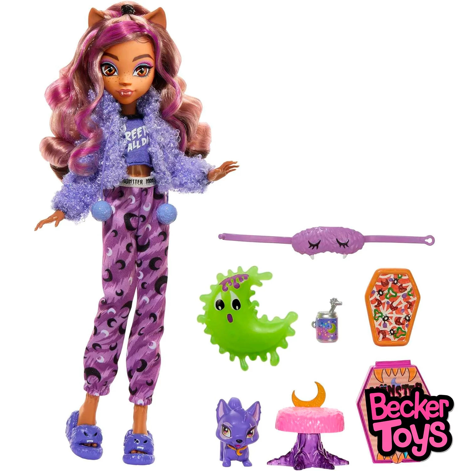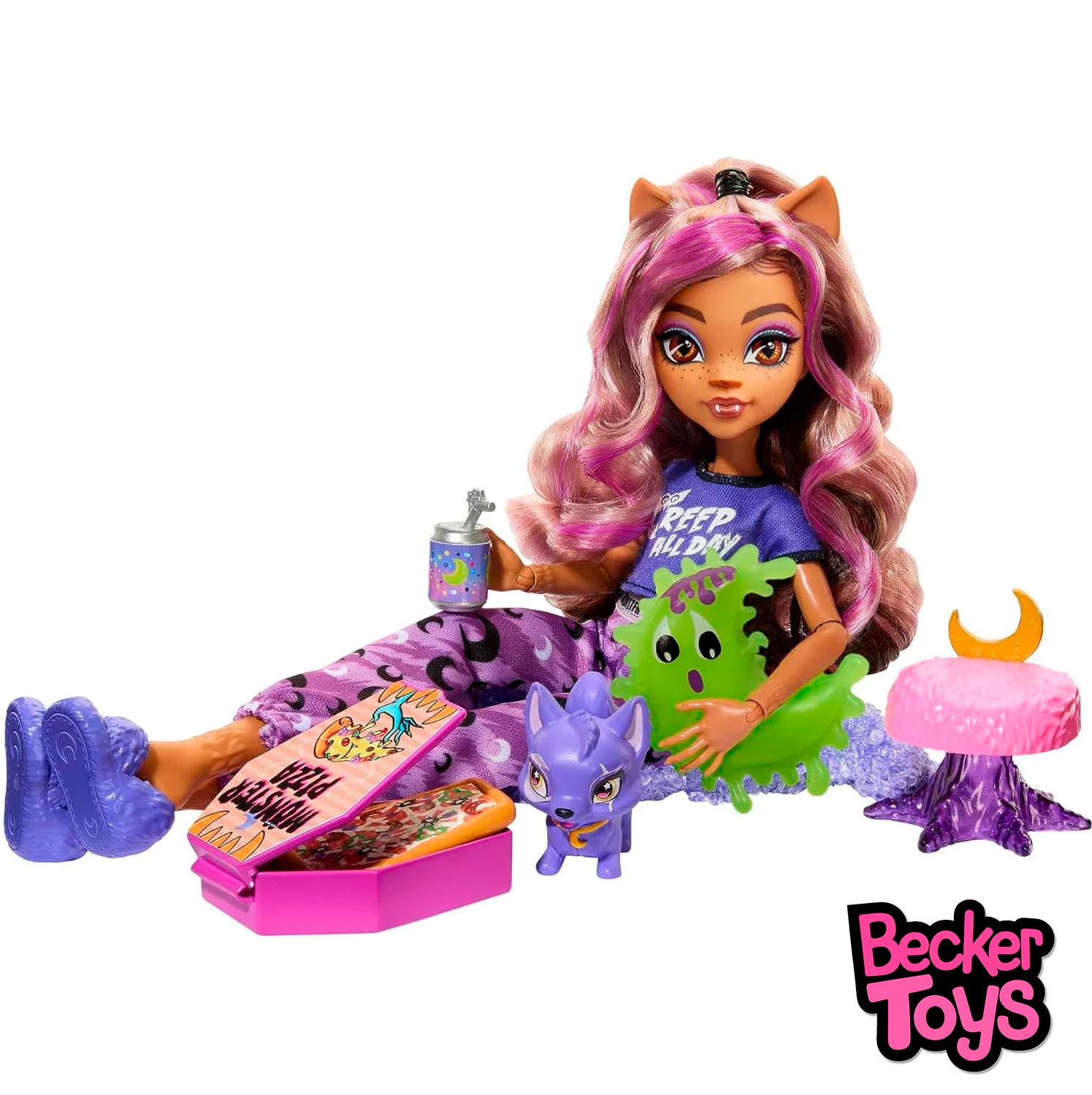 ¡El cárdigan suave de Clawdeen Wolf es monstruosamente cómodo! Lo combina encima de una camiseta corta con la frase Creep All Day y un pantalón deportivo con estampado de lunas. Esta chica está divina de la muerte con sus voluminosos rizos peinados en un semirrecogido. Completa su look con un antifaz de pelo y zapatillas. ¡La comodidad es muy importante! La mascota Crescent de Clawdeen Wolf tiene su propia cama. ¡Incluso tiene un adorno de luna creciente a juego con su collar! ¡Es la hora de comer y de las peleas de almohadas! Incluye todos los artículos necesarios para una fiesta de pijamas espeluznante: una almohada blandita, kom-buuu-cha y una pizza monstruosa con una caja en forma de ataúd.
