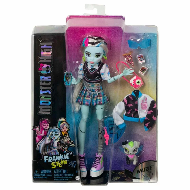 Es hora de volver a clase y la pandilla más divina de la muerte de Monster High derrocha un estilo monstruoso por los pasillos del instituto. La muñeca Frankie Stein lleva un electrizante conjunto de falda a cuadros, blusa con estampado de rayos y chaleco elegantemente escalofriante. Su look va acompañado de detalles sobrecogedores, como unas enormes zapatillas de plataforma, un cinturón de cadena, unas gafas de sol con detalles de relámpagos, unos pendientes y unos pasadores para el pelo. Lleva el look de la muñeca Frankie Stein al siguiente nivel con una chaqueta universitaria Voltageous y accesorios monstruosamente divinos, como una mochila con forma de relámpago, una cámara de fotos, un aperitivo de pizza y un smartphone. ¡Vive infinidad de historias espectroculares con Watzie, su terrorífico perro mascota!