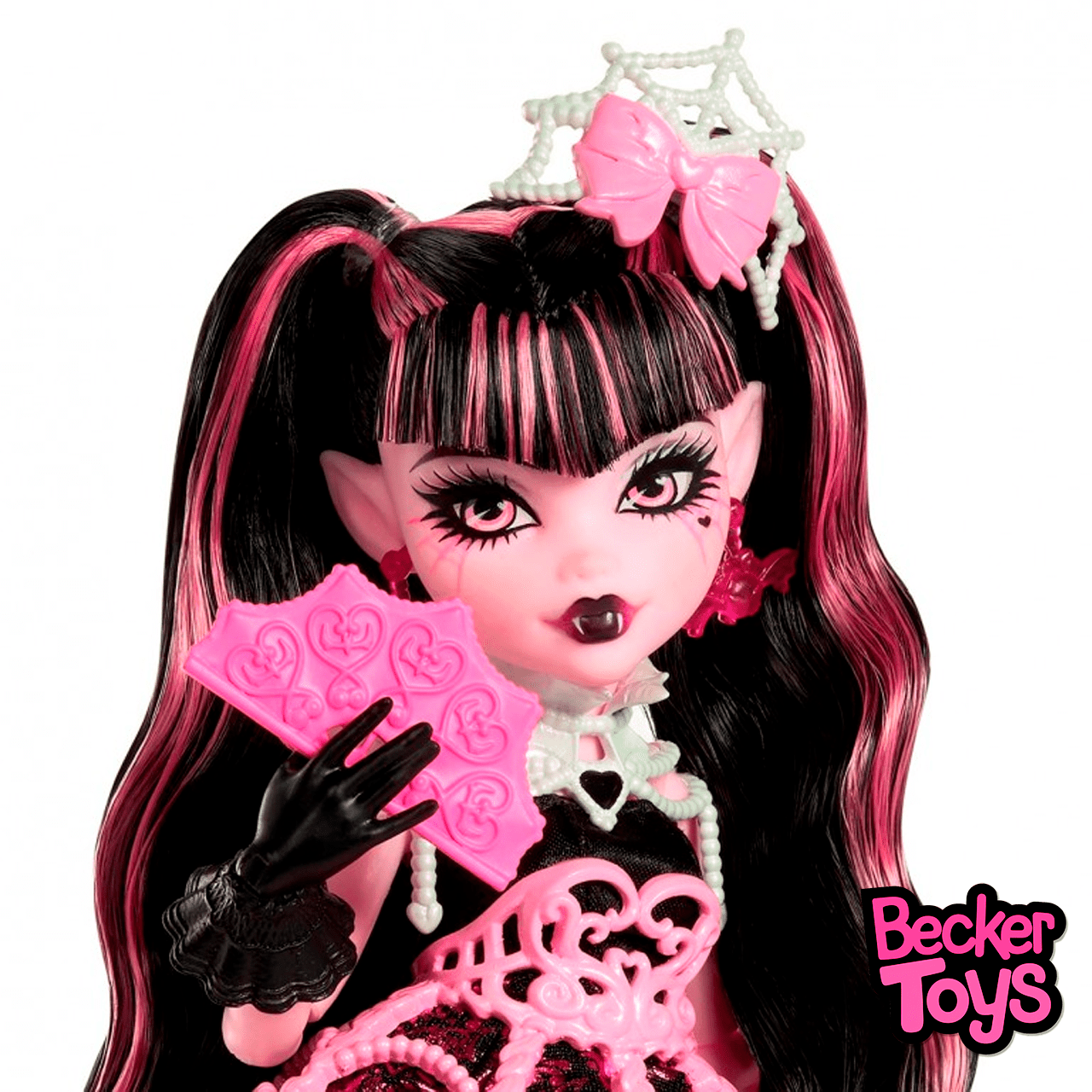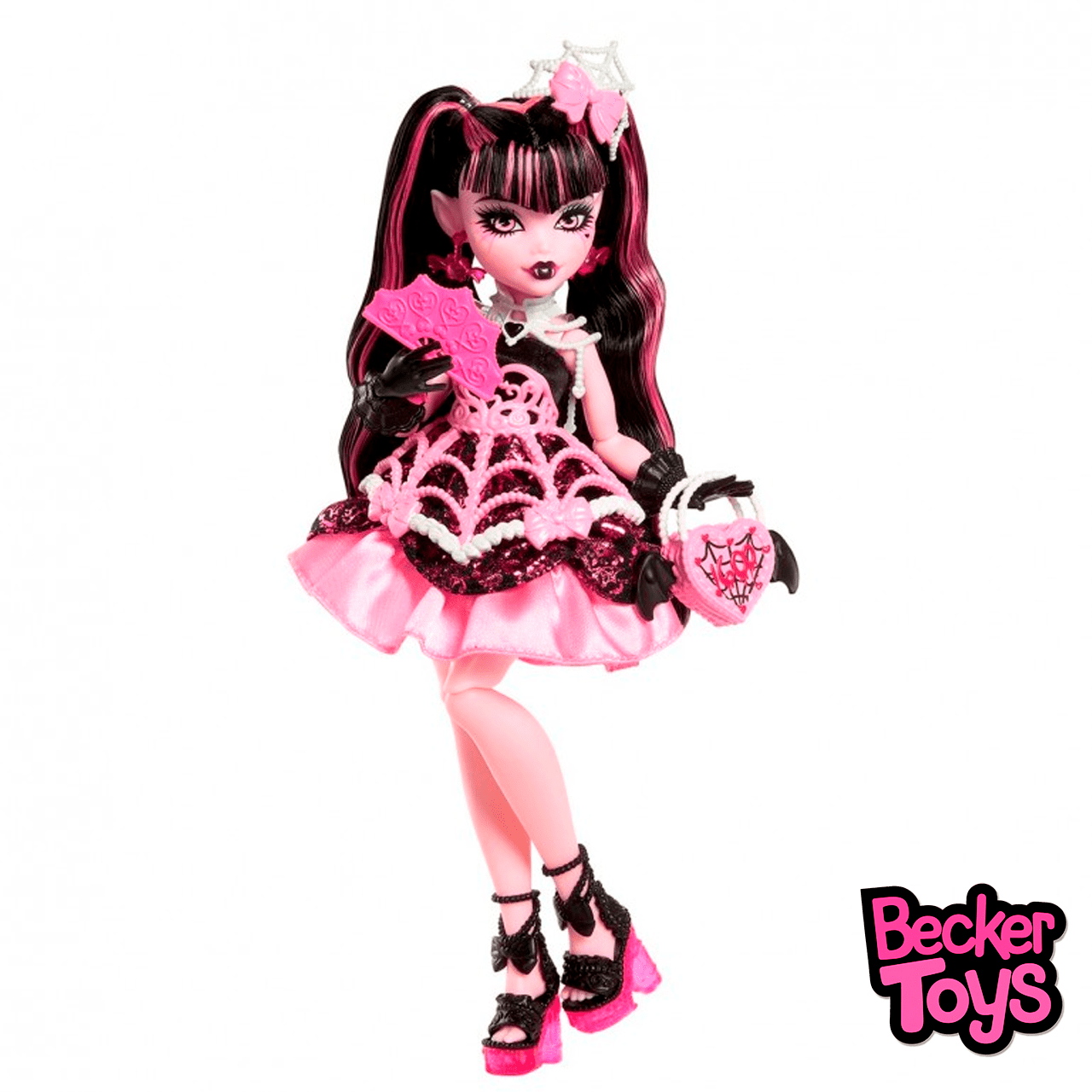 ¡Draculaura está lista para celebrar su Sweet 1600 con un estilo espantosamente encantador! La muñeca Monster High Scary Sweet Birthday Draculaura luce un vestido rosa satinado con una falda de jaula de telaraña y guantes negros, complementado con un cuello de «perlas» y tacones inspirados en lazos.