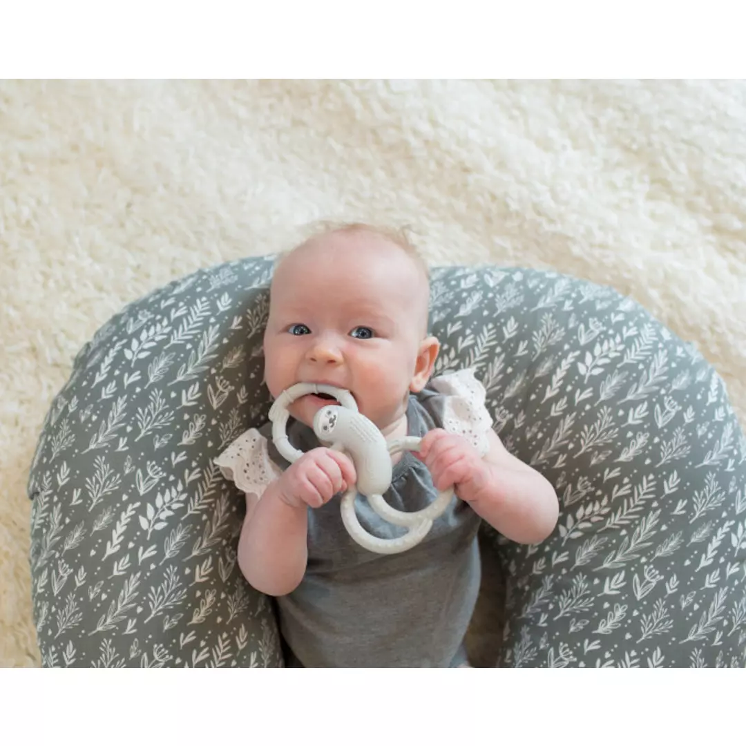 - Calma las encías. Masajea las encías doloridas del bebé con múltiples texturas, presentadas en los brazos, la barriga y las piernas del perezoso.