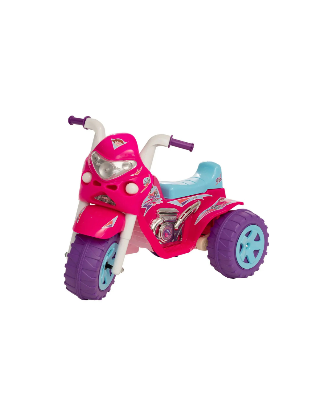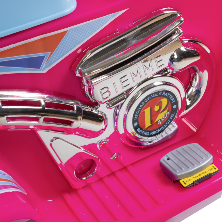 La Super GP Raptor Super Girl de Biemme es una moto-triciclo eléctrica ideal para niñas de 2 a 5 años. Con robustas ruedas con banda de goma y silueta deportiva, incorpora panel frontal con luces, sonidos y botón para marcha adelante y reversa, además de asiento anatómico y pedal acelerador con bloqueo extraíble para seguridad. Soporta hasta 35 kg, ofrece diversión al aire libre con total confianza y estilo.