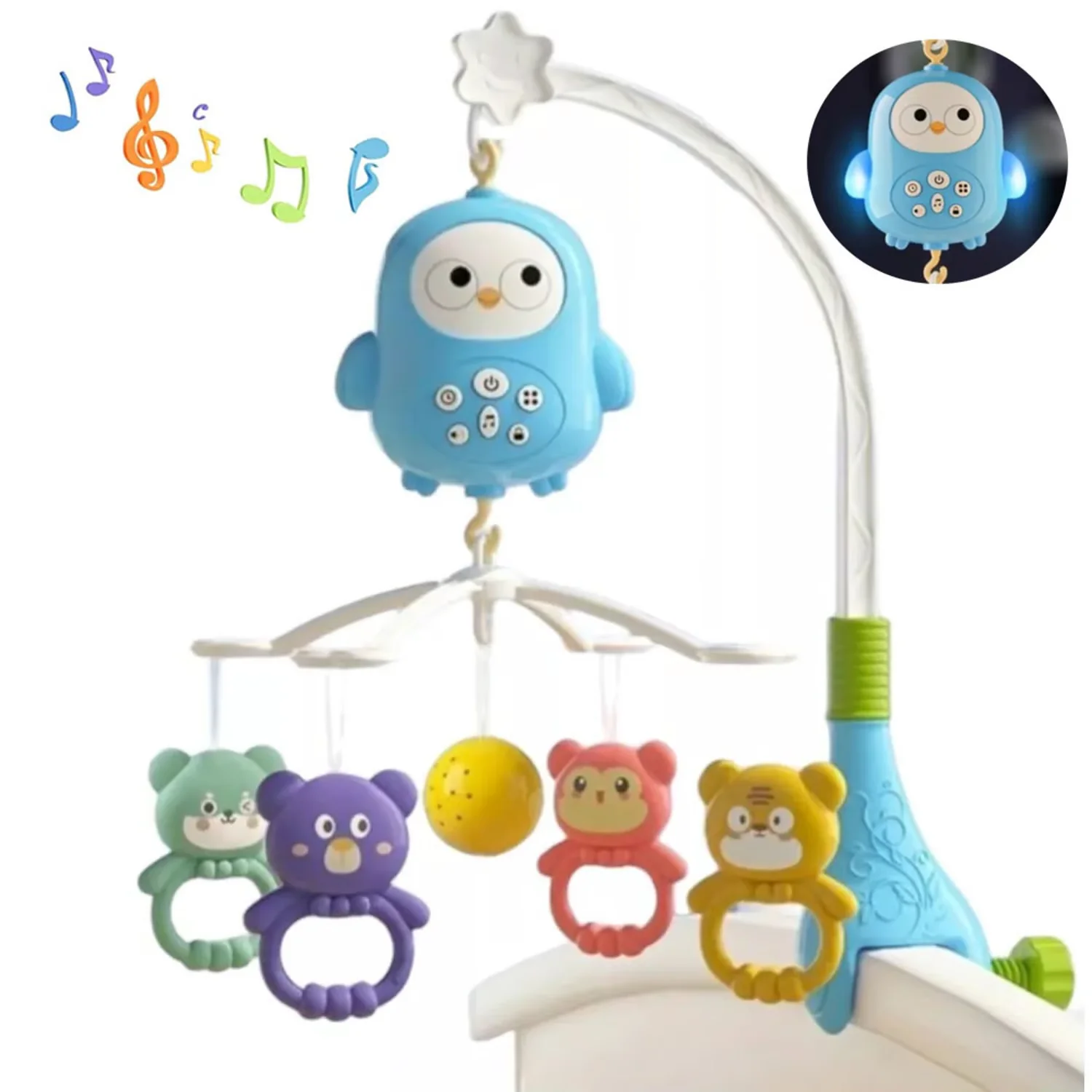 Elementos incluidos: 1 Móvil cuna, 4 animales colgantes, gira 360°