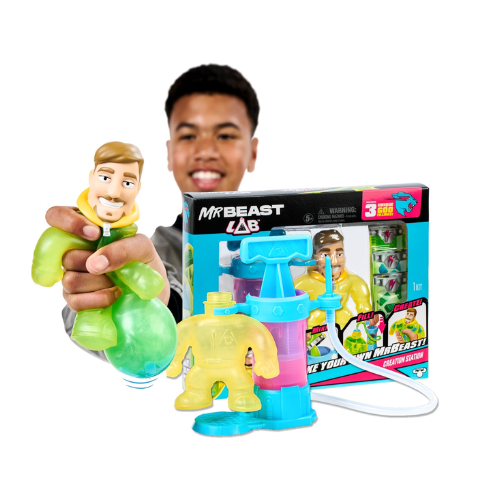 Estación de creación MrBeast Lab con figura estirable para personalizar y jugar. Incluye materiales para rellenar y estirar tu personaje al estilo del laboratorio de MrBeast. Perfecto para fans y diversión creativa.