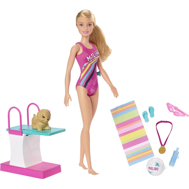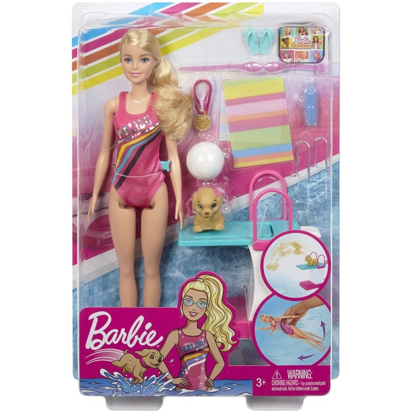 ¡Crea historias y juegos deportivos inspirados en Barbie Dreamhouse Adventures Nadadora! La imaginación de las niñas puede sumergirse en la diversión con esta muñeca nadadora Barbie que viste coloridos trajes de baño con rayas deportivas y detalles brillantes. Cuando esté lista para entrar al agua, presiona la palanca de la cintura para ver cómo se mueven sus piernas y juega con la acción de «nadar». Coloca la perrita amiga de la muñeca Barbie en el trampolín para ver su voltereta o llénala de agua y apriétala: ¡funcionará como juguete lanza agua! A las aspirantes a atletas les encantará llevarla a aventuras activas y explorar historias deportivas, porque cuando una niña juega con Barbie, puede ser lo que quiera ser.