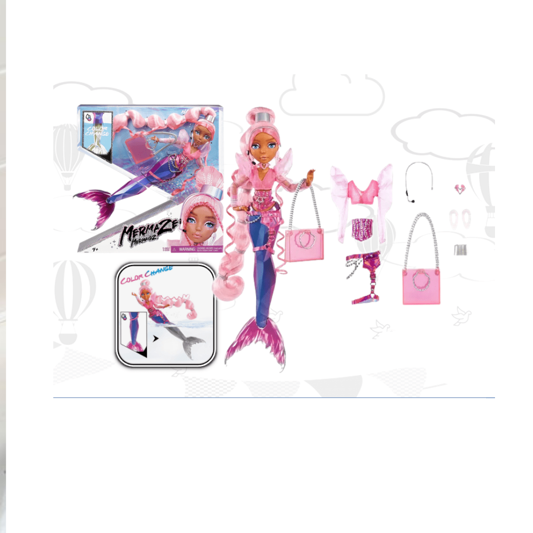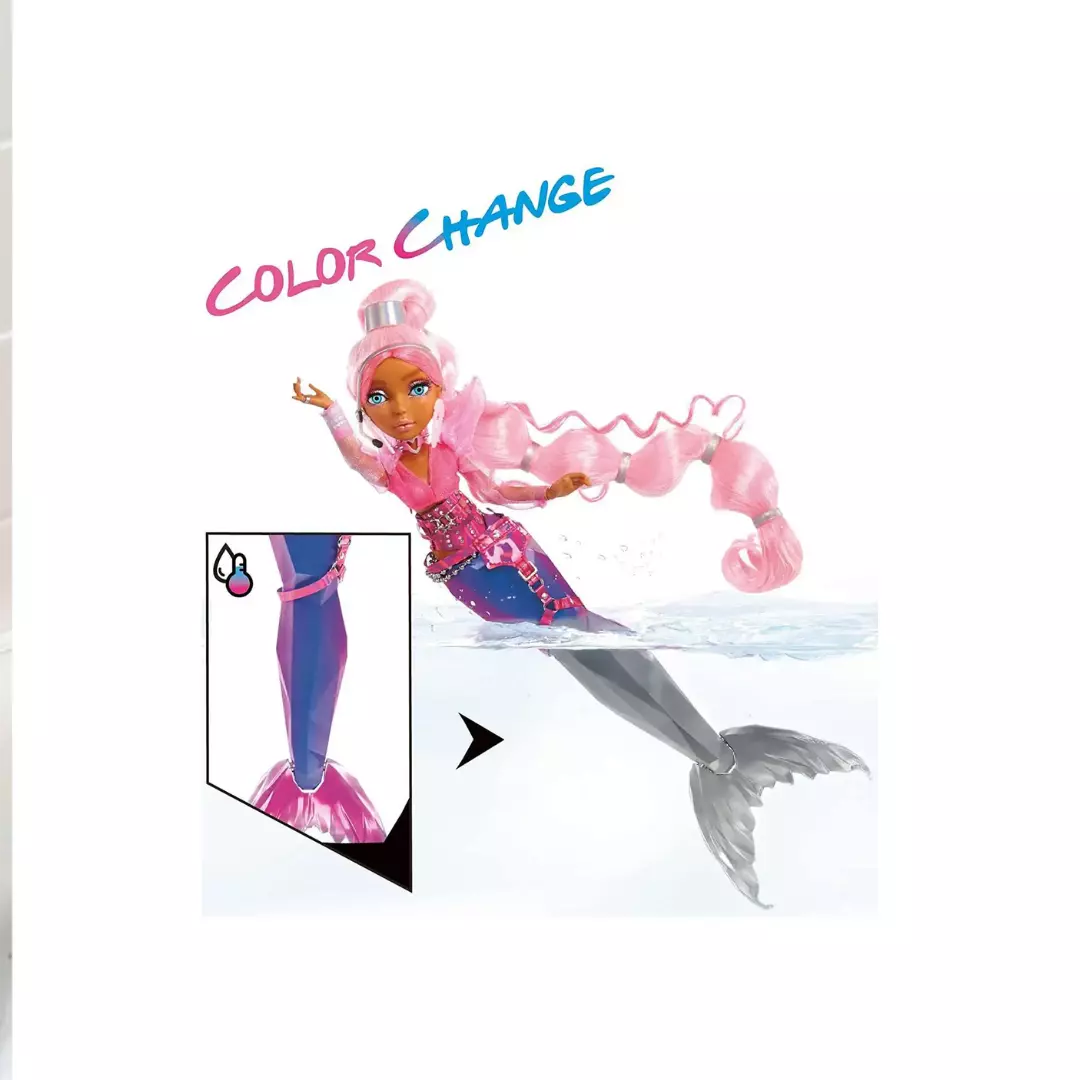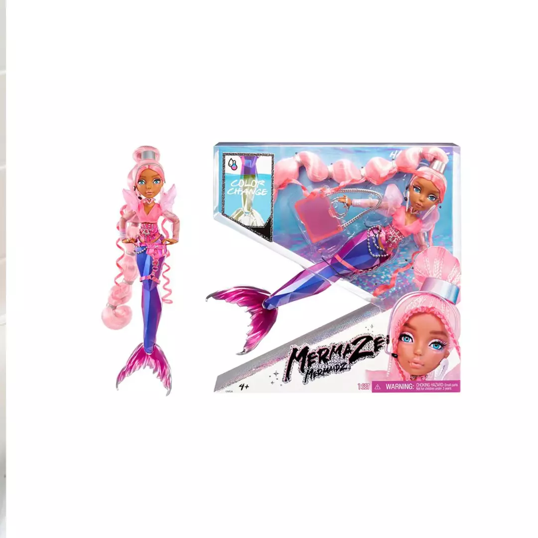 Mermaze Mermaidz Muñeca sirena de moda de lujo. Tiene una cola esculpida única con un acabado iridiscente y detalles de brillo multicolor y largos aretes plateados. Después de sumergirse en agua helada, la sirena cambia espectacularmente el color de toda la cola (el tono va del rosa plateado al increíble negro). El set incluye 4 gominas con purpurina, 5 pinzas, un peine y un cepillo, gracias a los cuales crearemos muchos peinados bonitos. Es posible utilizar gel con brillantina en el cabello (el producto se elimina fácilmente con lavado). Mermaze tiene ojos hermosos y brillantes y pestañas largas y reales.