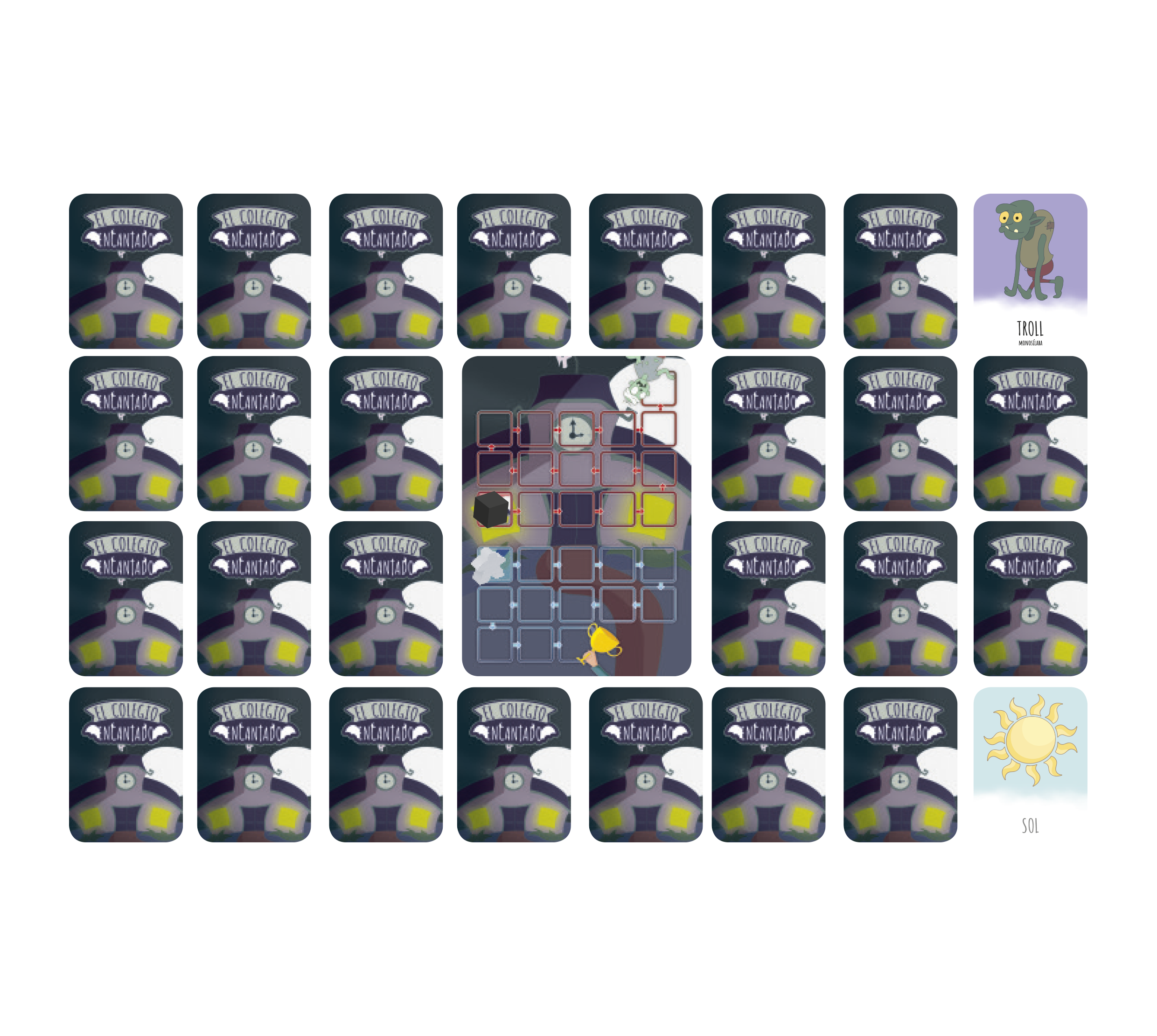 Juego cooperativo. Los jugadores deber n huir del colegio encantado antes de que les atrape. Para ello deber n memorizar el lugar de los objetos y monstruos que se van encontrando en el juego.