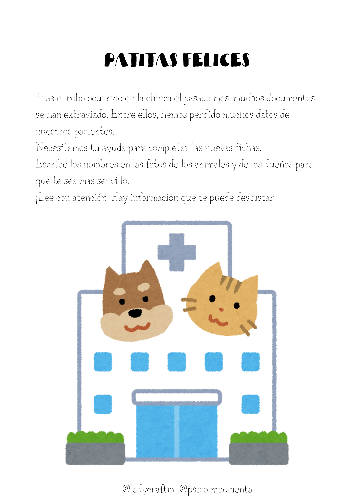 Ha ocurrido un robo en una clínica veterinaria. Muchos de los datos de los pacientes han desaparecido. Trabajad en equipo para rellenar todas las fichas. Material multinivel