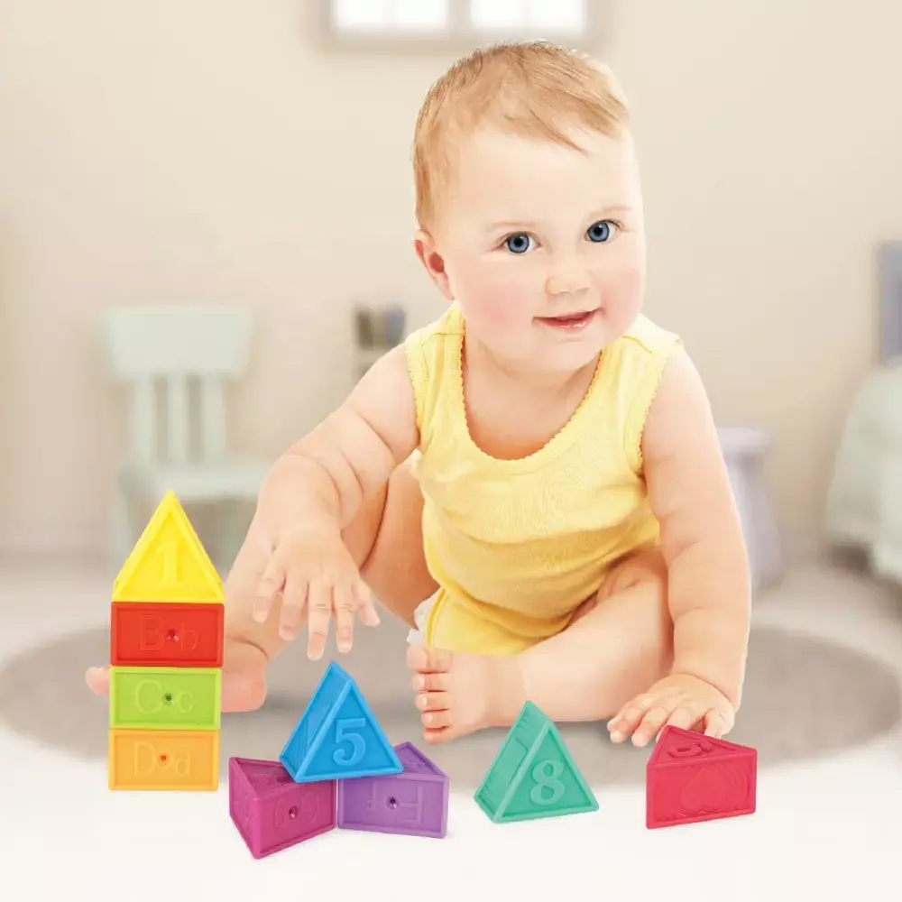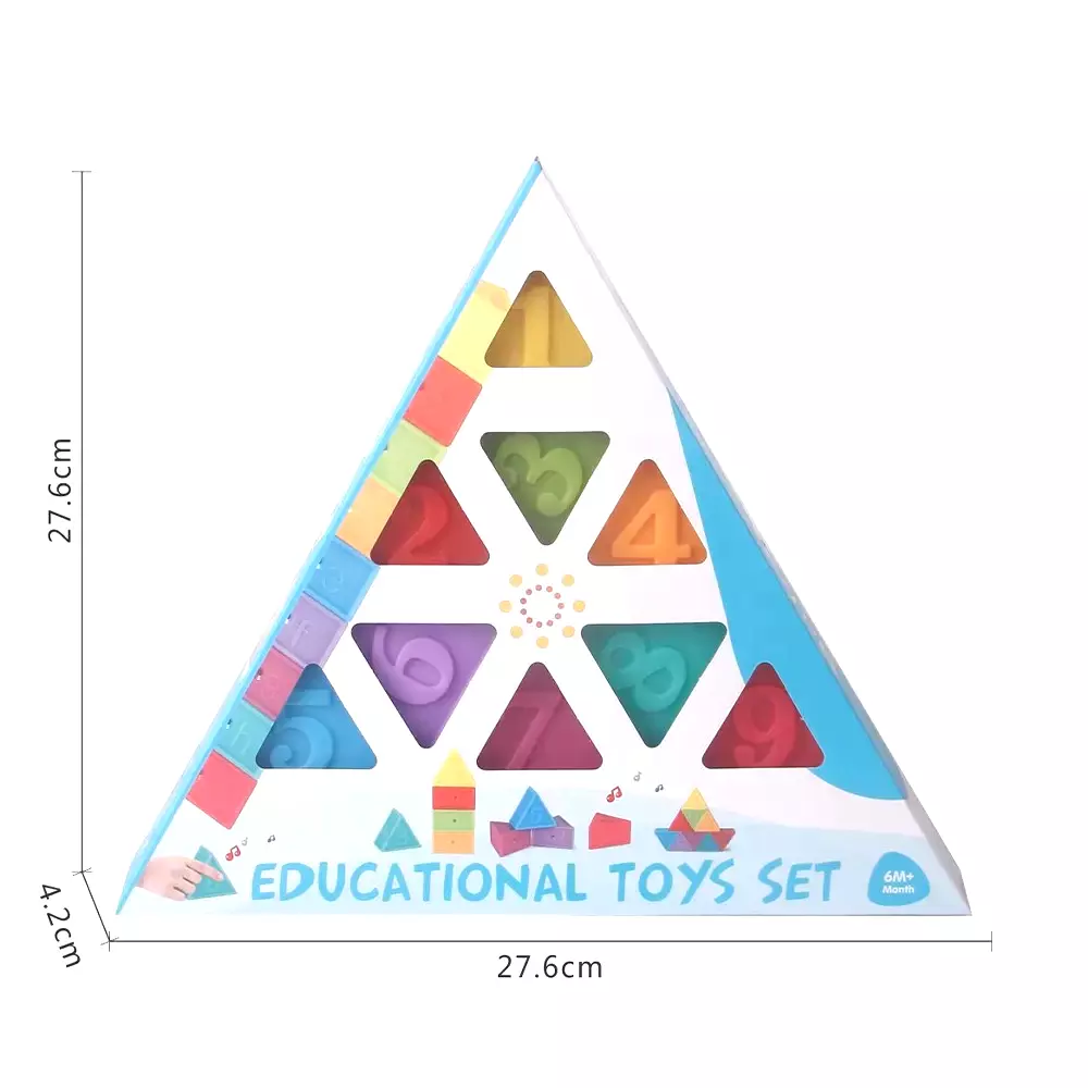 - Desarrollo de la motricidad fina: Apilar los triangulos requiere que el bebé use sus manos y dedos con precisión, lo que ayuda a mejorar la coordinación ojo-mano y la destreza manual.