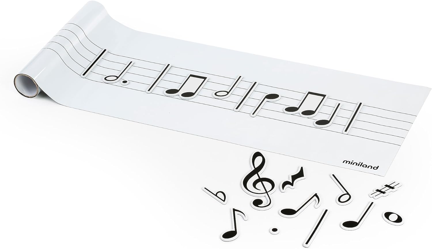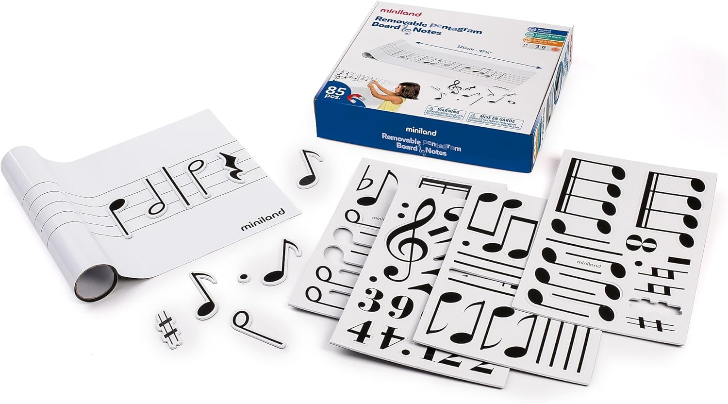 Pizarra musical pautada cuya parte trasera se adhiere sobre cualquier superficie plana. Se puede quitar y poner las veces que sea necesario, con la tranquilidad de que no deja residuo, al ser removible y reutilizable. Incluye 85 figuras musicales magnéticas para crear composiciones sobre el pentagrama. Permite la escritura con un rotulador borrable (no incluido).