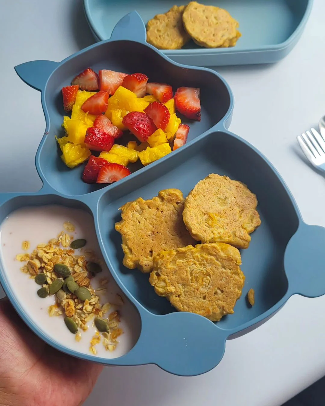 Elementos incluidos: 1 plato de silicona modelos ardilla 3 divisiones, cuchara y tenedor.