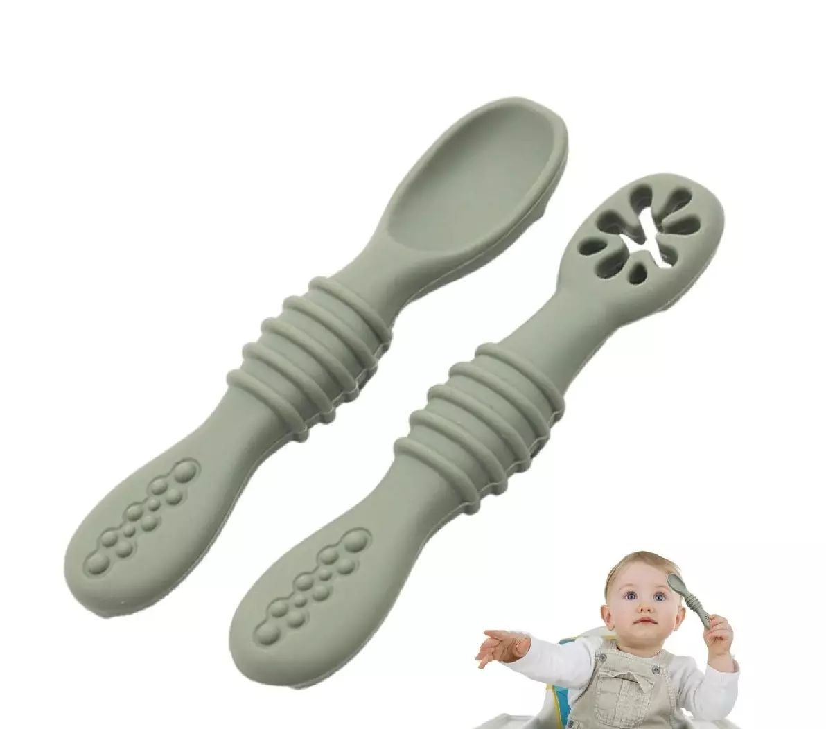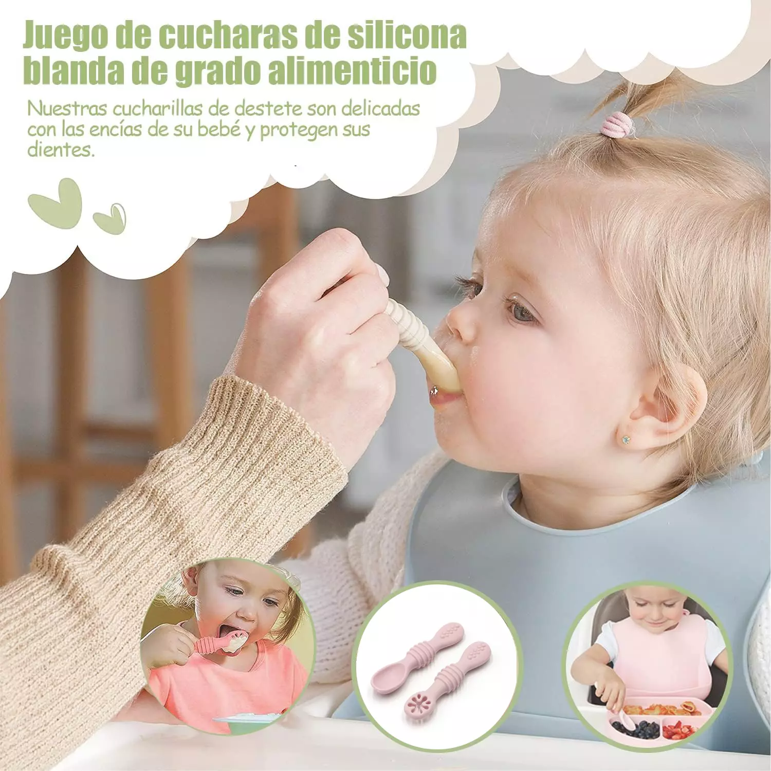 Pack de 2 cucharas formado por 1 cuchara aprendizaje (primera etapa), diseñada para comer los primeros alimentos sólidos, como purés, yogures de una manera rápida y segura, y una segunda cuchara fabricada en silicona suave para no dañar las encías del bebé. Ambas cucharas tienen un diseño ergonómico facilitando el agarre, siendo el mango del tamaño adecuado a la mano del bebé. Estas cucharas están recomendadas por nutricionistas infantiles y expertos en BLW.