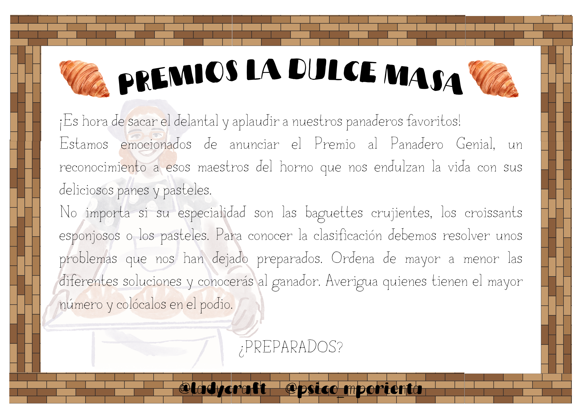 Material para trabajar la resolución de problemas. Averiguad en equipo quiénes son los ganadores de estos premios al mejor panadero. A partir de 4º de Educación Primaria.