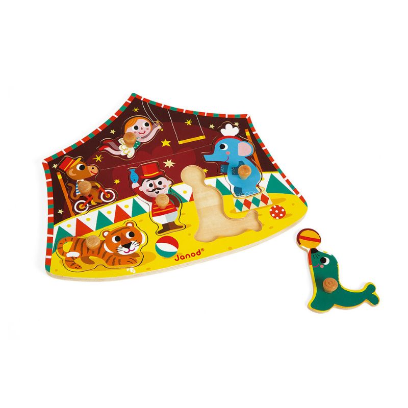 Contiene 6 piezas y un original tablero en forma de capa de circo donde se encajan las piezas.
