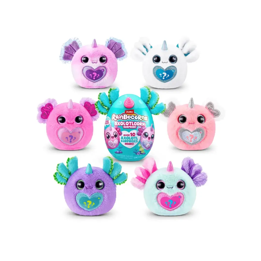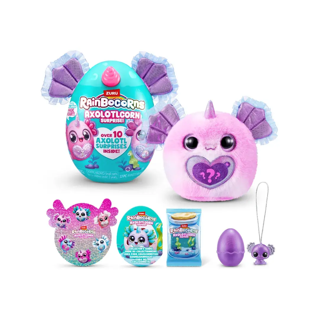 Sumérgete en la magia de Rainboville con el Rainbocorns Axolotlcorn Surprise de ZURU. Abre el huevo abrazándolo para liberar a tu suave axolotl y encuentra 10 sorpresas temáticas acuáticas, además de un tierno Boo‑Boocorn bebé oculto. Revela el “magic heart” pelando su corazón y descubre qué hace único a tu Axolotlcorn. Hay 6 modelos coleccionables diferentes, cada uno con su propio estilo.