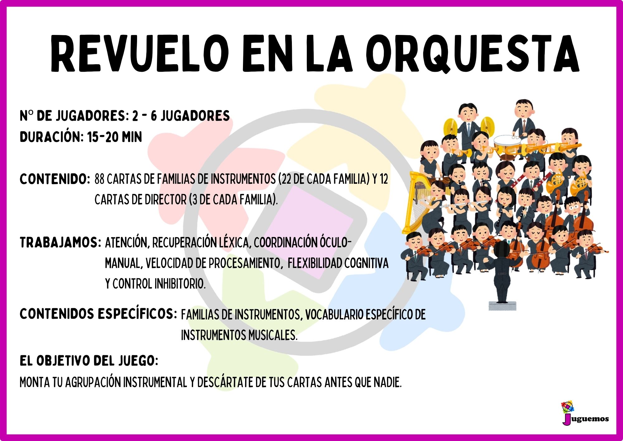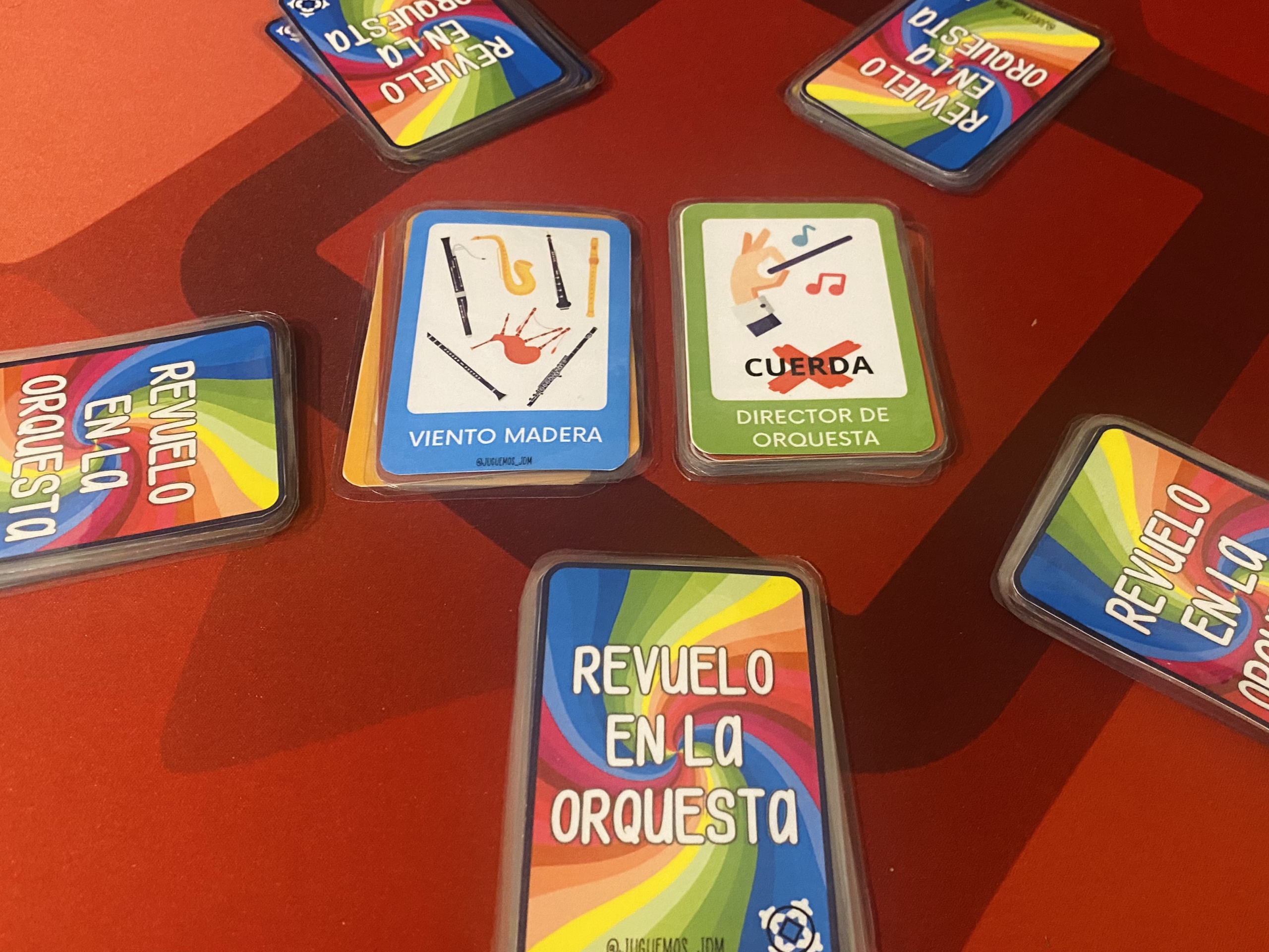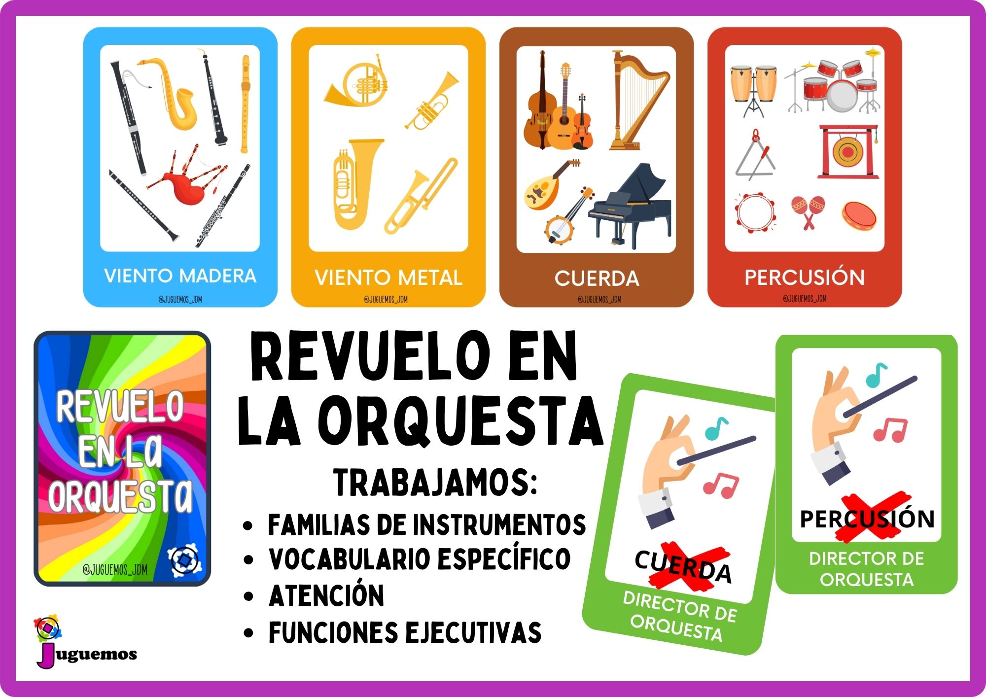 Entre todos montaremos una agrupación instrumental lo más rápido que podamos descartándonos de nuestras cartas y nombrando los instrumentos correspondientes. Pero cuidado con el director de orquesta porque nos indicará qué instrumentos deben permanecer en silencio.