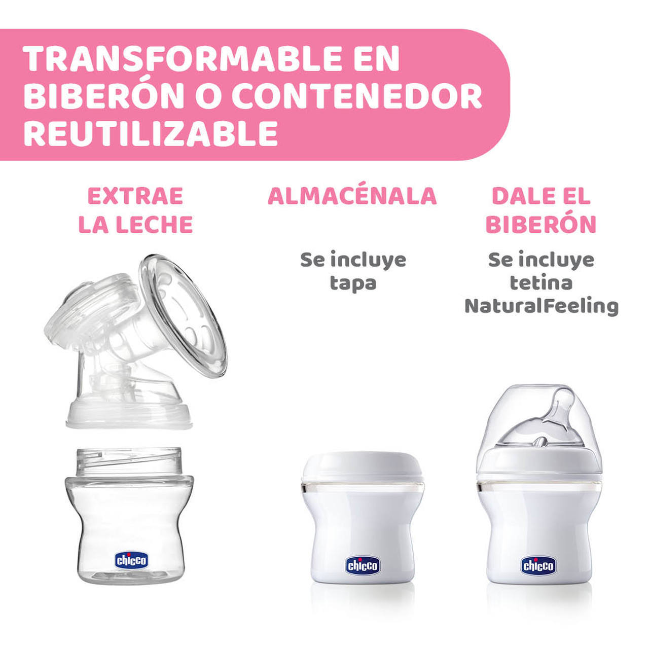 - SE TRANSFORMA EN BIBERÓN NaturalFeeling de 50ml con la tetina inclinada incluída, o en RECIPIENTE DE ALMACENAMIENTO con el tapón hermético incluído.