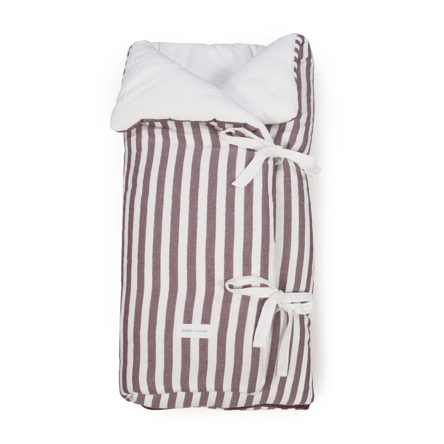 El saco arrullo Cherry de Pasito a Pasito está fabricado con una suave muselina de rayas 100% algodón en el exterior y muselina lisa en el interior de 70% bambú y 30% algodón.