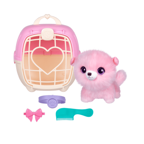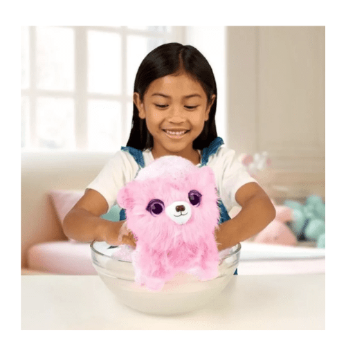 Se observan diferentes animalitos (como perrito, gatito y conejito) en tonos pastel rosados, con ojos grandes y brillantes, collares decorativos y detalles tiernos. El concepto del juguete se centra en el cuidado y la sorpresa, mostrando claramente el cambio de una apariencia despeinada a una completamente esponjosa y adorable. 🐾💖