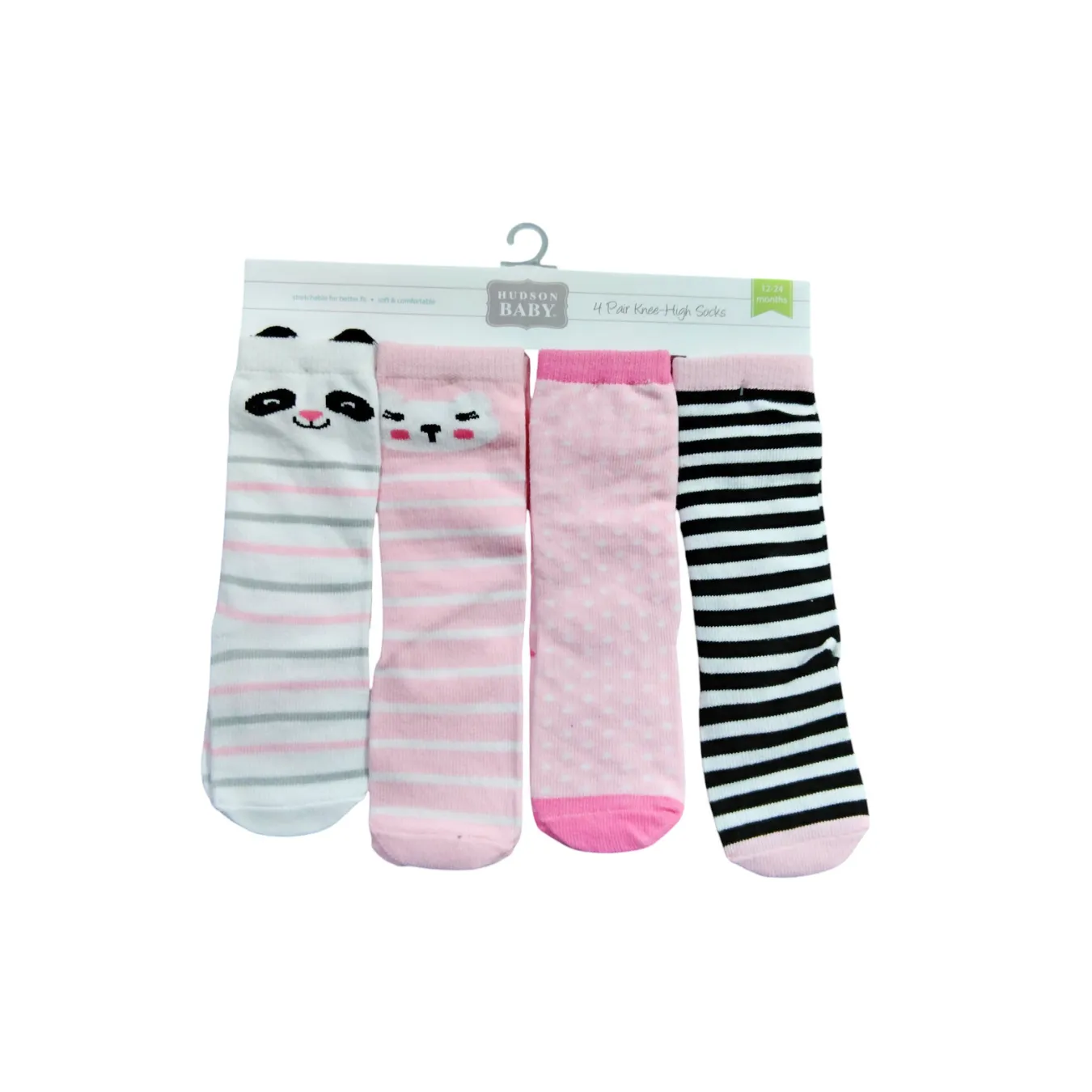 Este encantador set de 4 pares de medias hasta la rodilla es ideal para bebés de 12 a 24 meses. Incluye diseños divertidos de caritas de ositos y panda, rayas en tonos pasteles, lunares y estilo clásico en blanco y negro. Fabricadas en tela suave y elástica, brindan comodidad y abrigo todo el día.