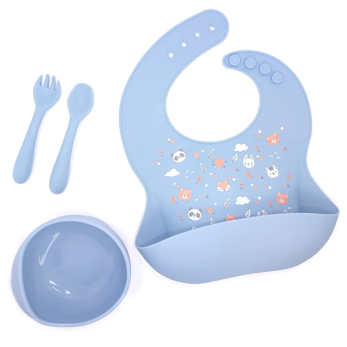 Elementos incluidos: 1 bolw de silicona clasic, 1 babero deluxe, 1 cuchara, 1 tenedor