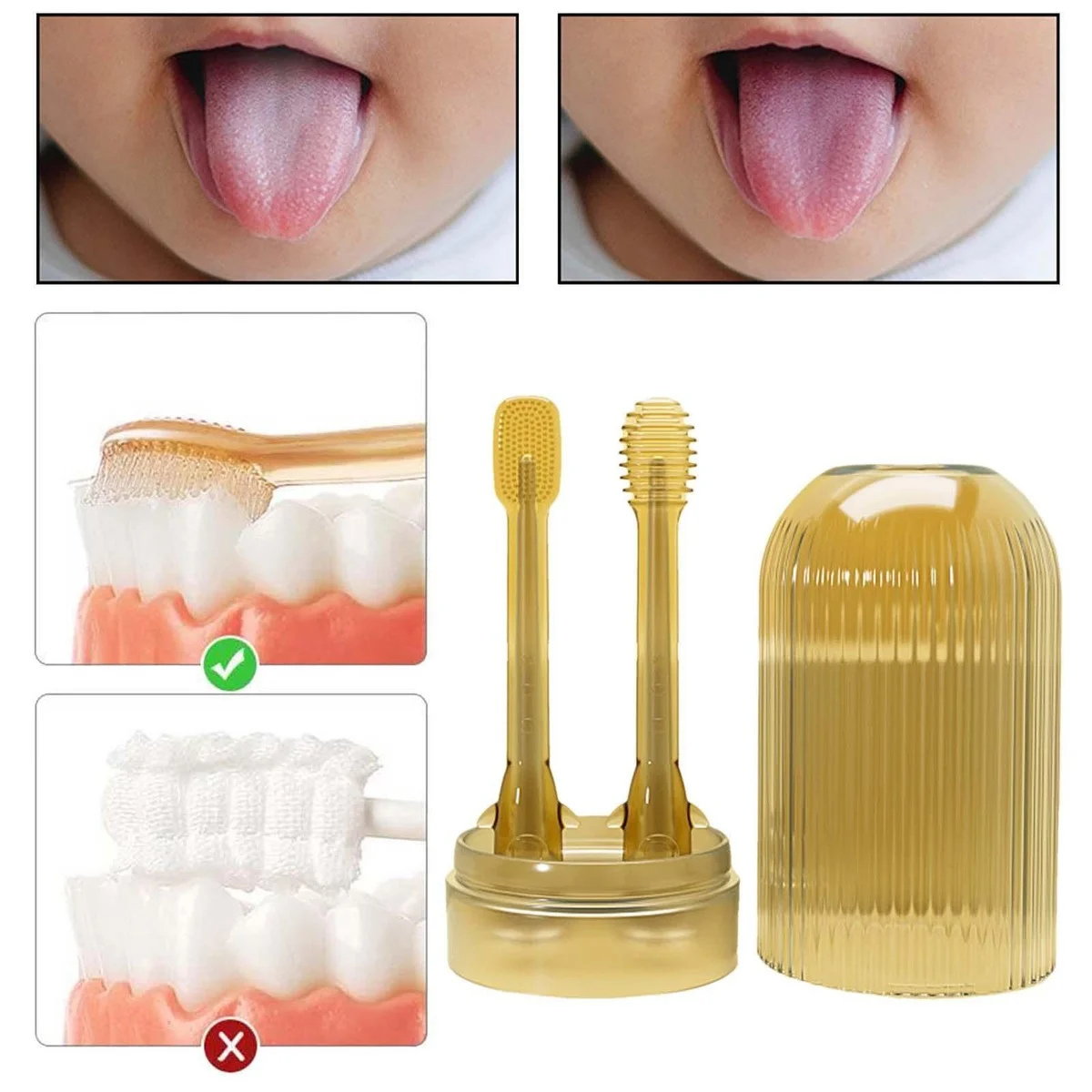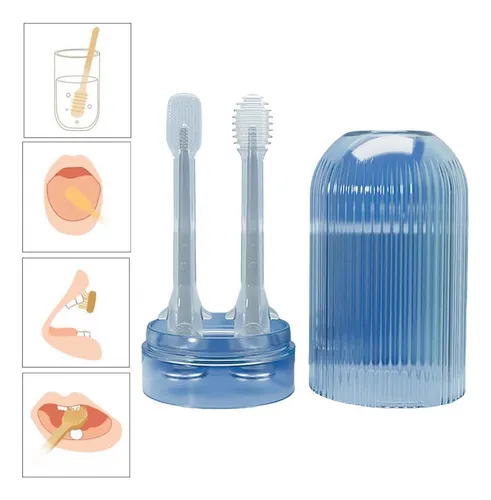 Elementos incluidos: 1 Cepillo de dientes de silicona para bebés, 1 Limpiador de lengua ultrasuave, Tacita a prueba de polvo para mantenerlo siempre limpio