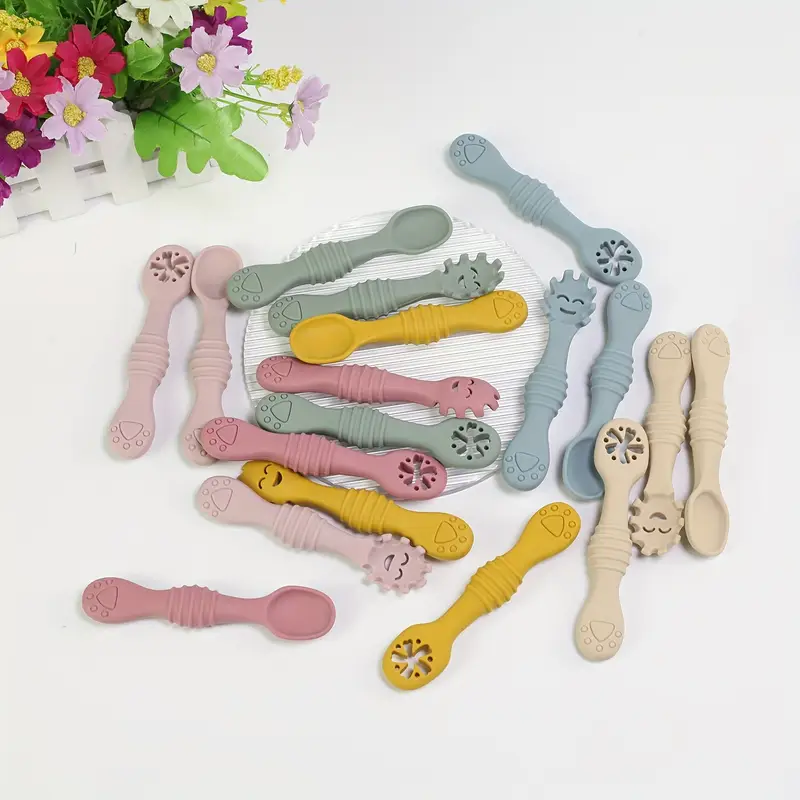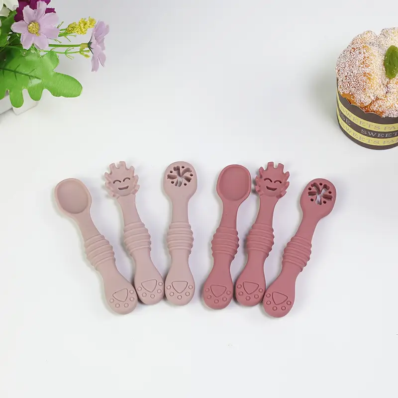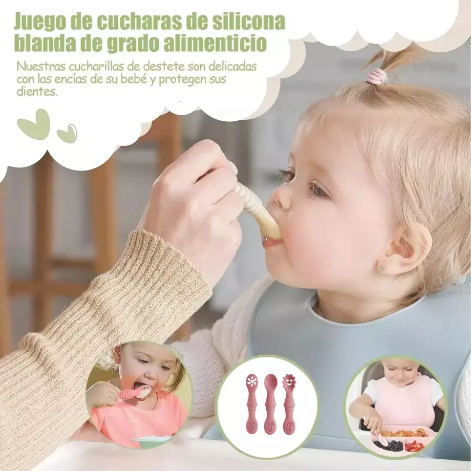 Pack de 3 cucharas formado por 1 cuchara aprendizaje (primera etapa) diseñada para comer los primeros alimentos sólidos, como purés, yogures de una manera rápida y segura, una segunda cuchara fabricada en silicona suave para no dañar las encías del bebé y una tercera cochara que atrapa alimentos mas espesos. Las cucharas tienen un diseño ergonómico facilitando el agarre, siendo el mango del tamaño adecuado a la mano del bebé. Estas cucharas están recomendadas por nutricionistas infantiles y expertos en BLW.